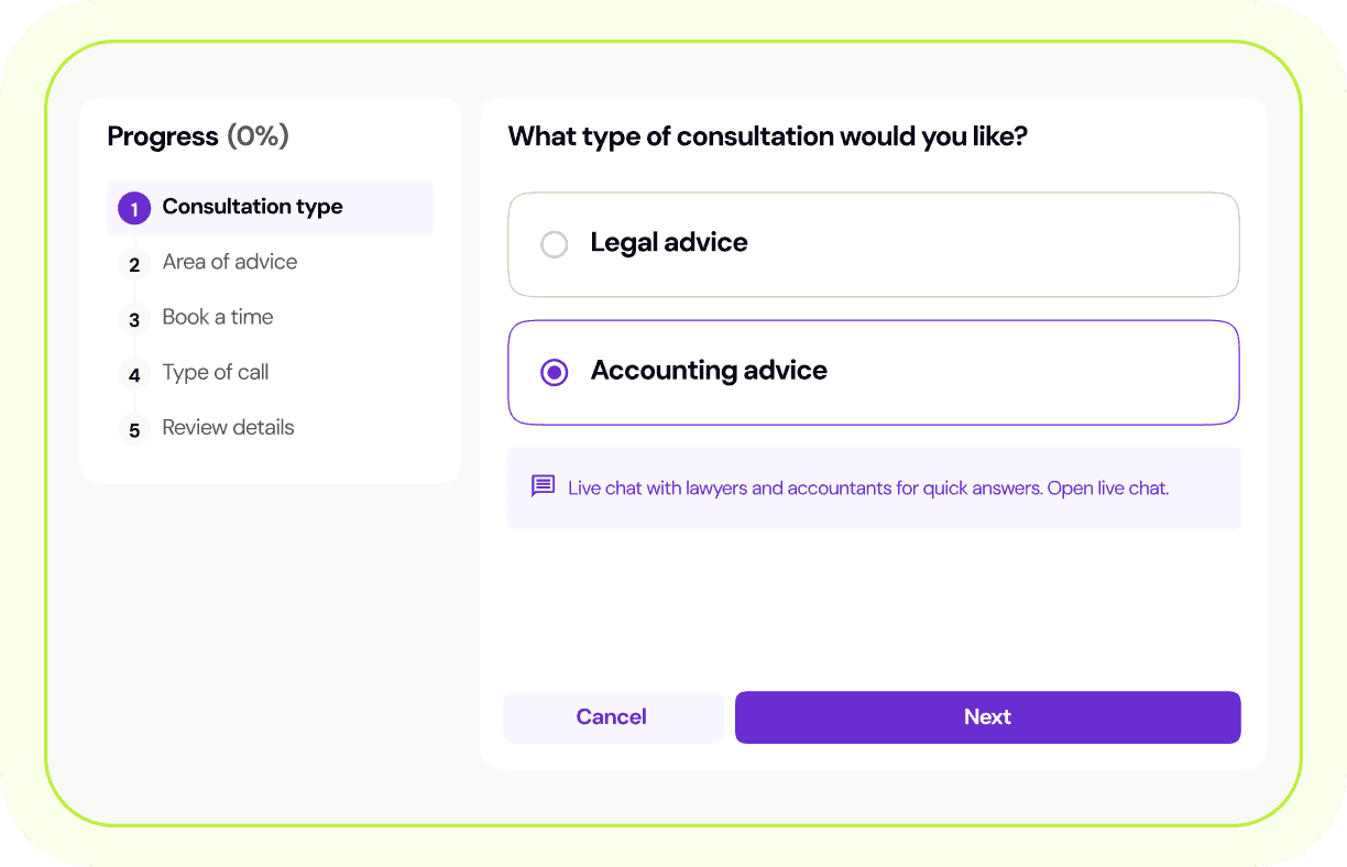 Our Plan gives you year-round access to quality accounting advice from Lawpath accountants without paying by the hour. As a plan member, you receive unlimited 30-minute consultations with a trusted accountant to discuss your accounting matters for actionable advice to enhance your business. You also get unlimited access to the Lawpath Platform including legal workflows, eSignatures, $10,000 worth of partner offers, and much more.