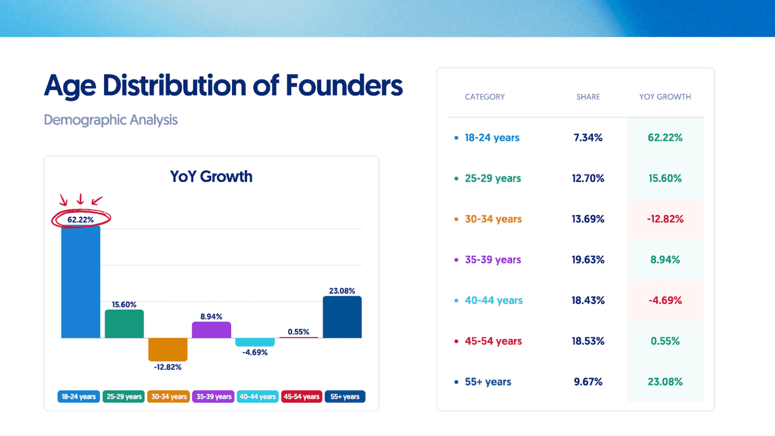 But the real momentum sits with the under-30 founders. Together, the 18- to 24-year-old and 25- to 29-year-old age groups now hold just over 12% of the pool. That may seem small beside the mid-career share, but their growth is unmatched. In the last year alone, applications from the youngest group jumped 62%.