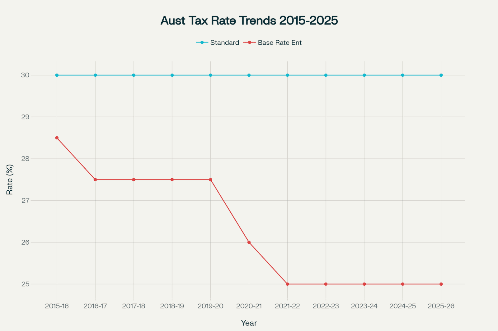 The graph below showcases how company tax rates in Australia have changed over the past 10 years, highlighting a gradual decrease for base-rate entities. This reflects government policy shifts aimed at supporting smaller businesses. The standard rate for all other companies has remained steady at 30%.