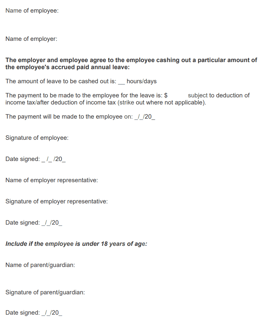 Every time annual leave is cashed out, there must be a genuine, separate written agreement between the employer and the employee confirming the arrangement.