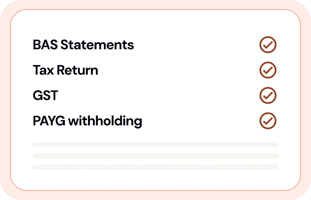 *The Tax Plan is per entity for businesses with an annual revenue of under $400,000. The plan covers lodgement of 4 x Upcoming BAS statements and these will be confirmed during onboarding. Past outstanding lodgements and book-keeping is not included and will be quoted separately. Please refer to the full terms and conditions here.