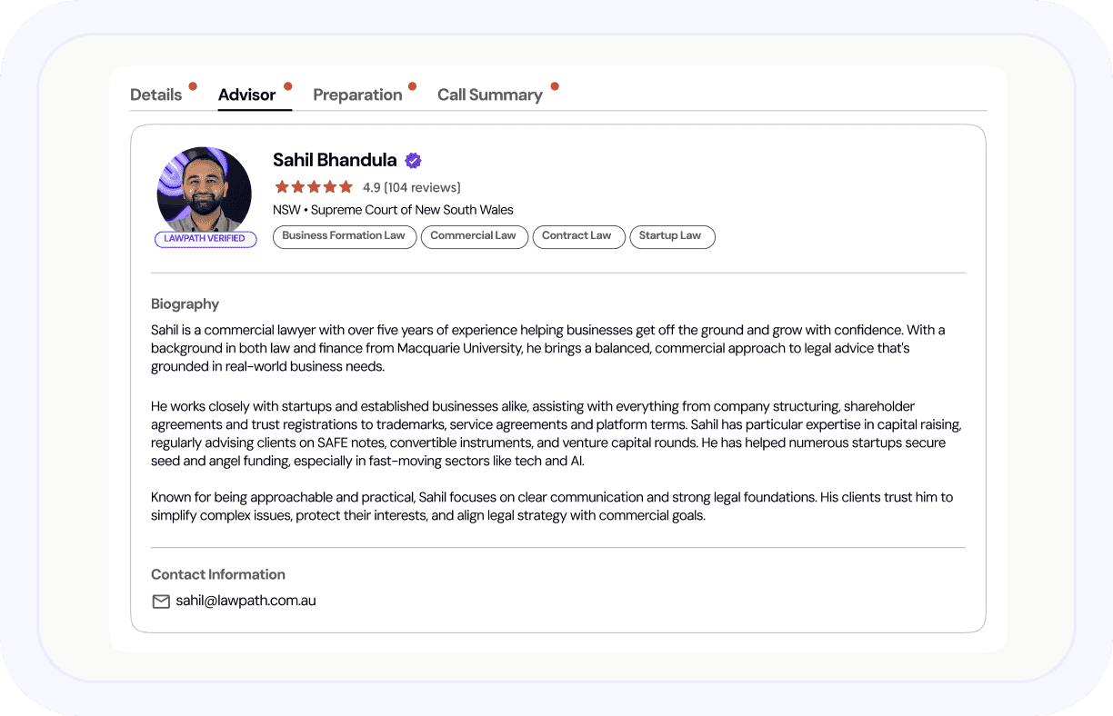 Join the 650,000+ Australian businesses that rely on Lawpath for legal and accounting guidance. Start with a consultation today.
