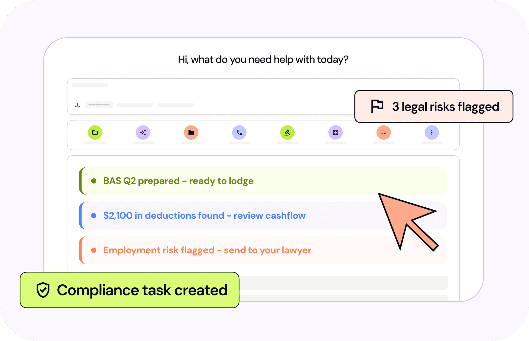 Real-time data from your tax systems, legal activity, ASIC, ATO, Fair Work, IP Australia and your day-to-day platform usage.