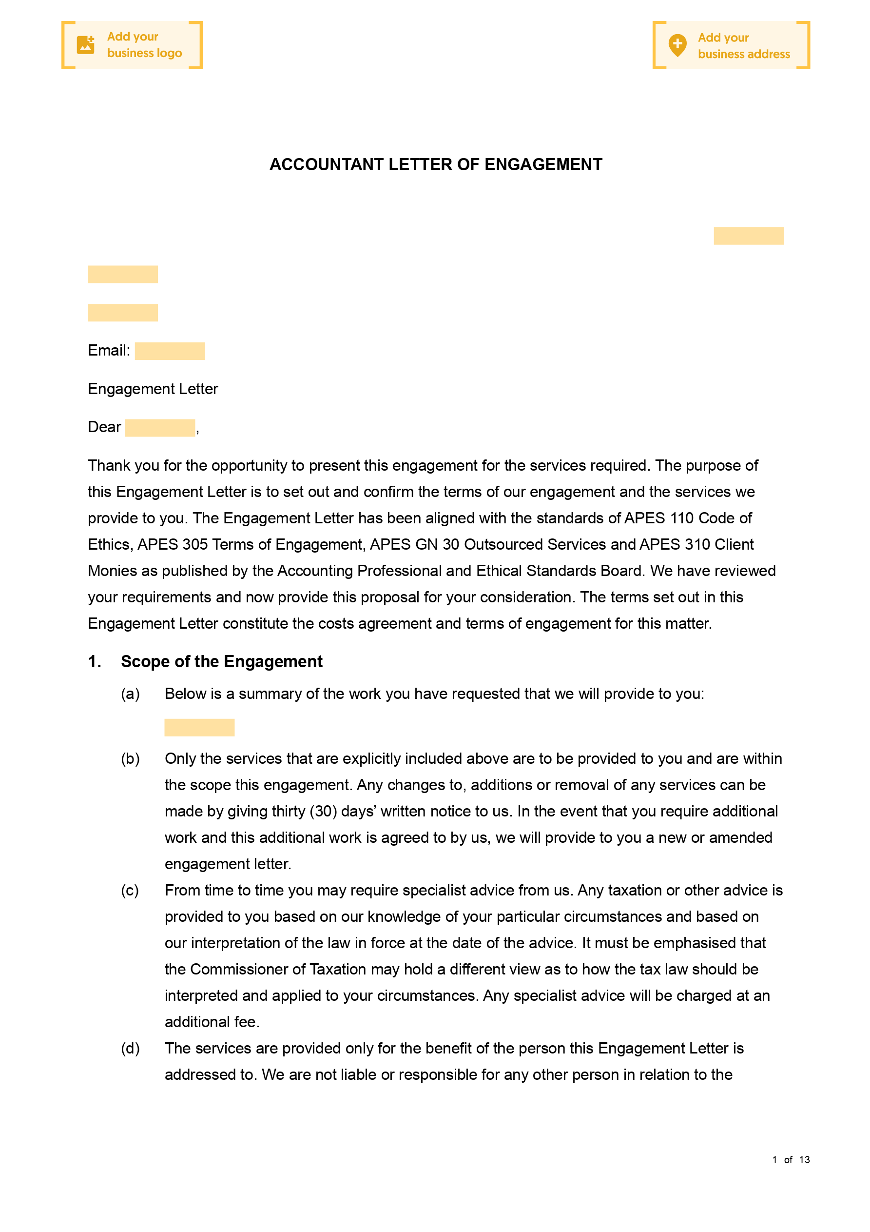 The accountant letter of engagement will not just define the scope of services for the client, but also outline the responsibilities of the accountant, alongside the client. This can involve areas such as privacy and confidentiality, time duration of tasks and methods to communicate.