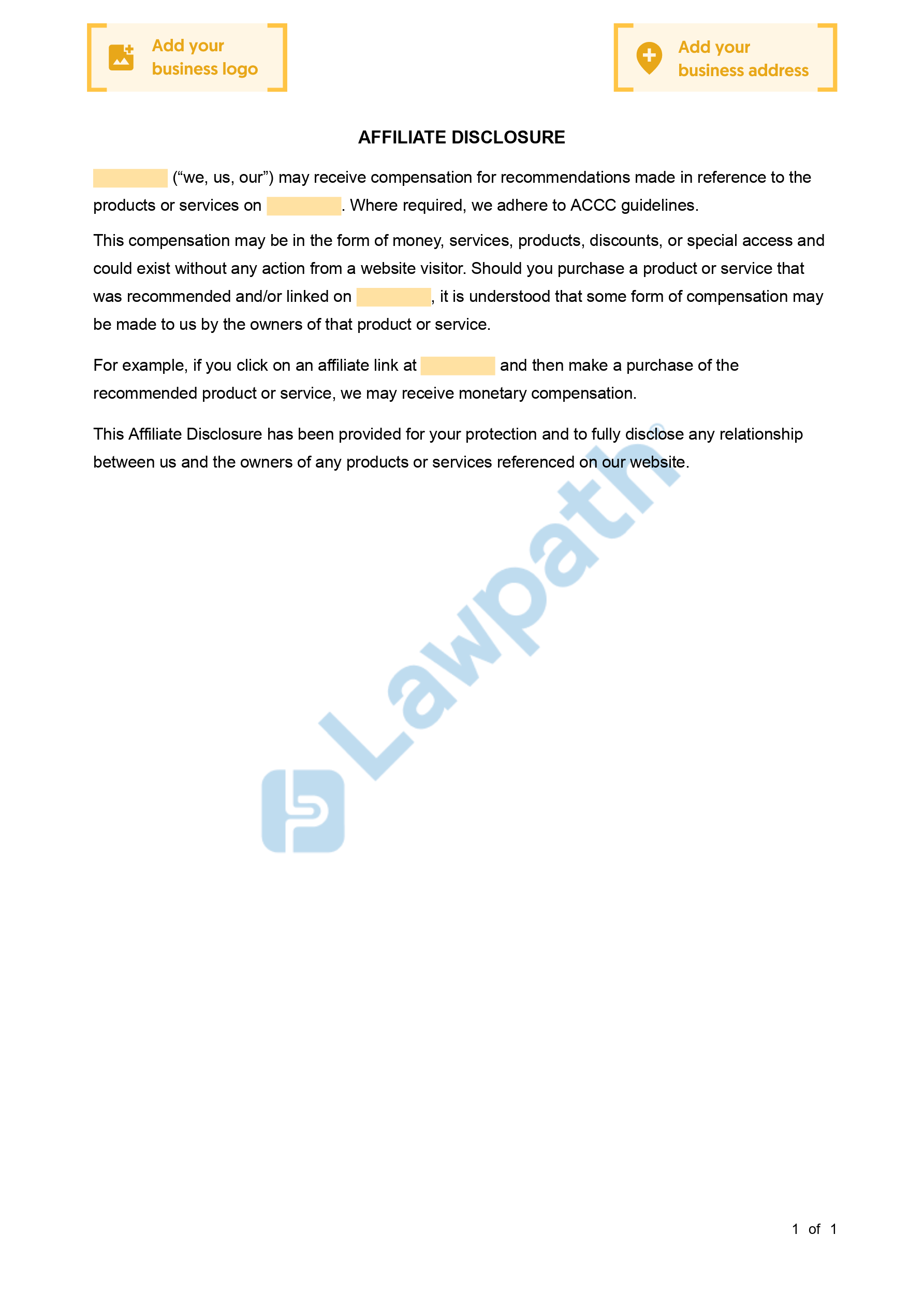 An Affiliate Link Disclosure is provided to visitors of your website to fully disclose any relationship between you and the owners of any products or services referenced on your site. It ensures that affiliate marketers are transparent about actions that may potentially impact a consumer's decision-making process. Some jurisdictions require you to disclose that you are receiving compensation for any linked products or services on your site. You should place this Affiliate Link Disclosure in obvious areas on your website which are easy for visitors to see. By disclosing affiliate relationships, customers are made fully aware of them and can enter into transactions with complete transparency.