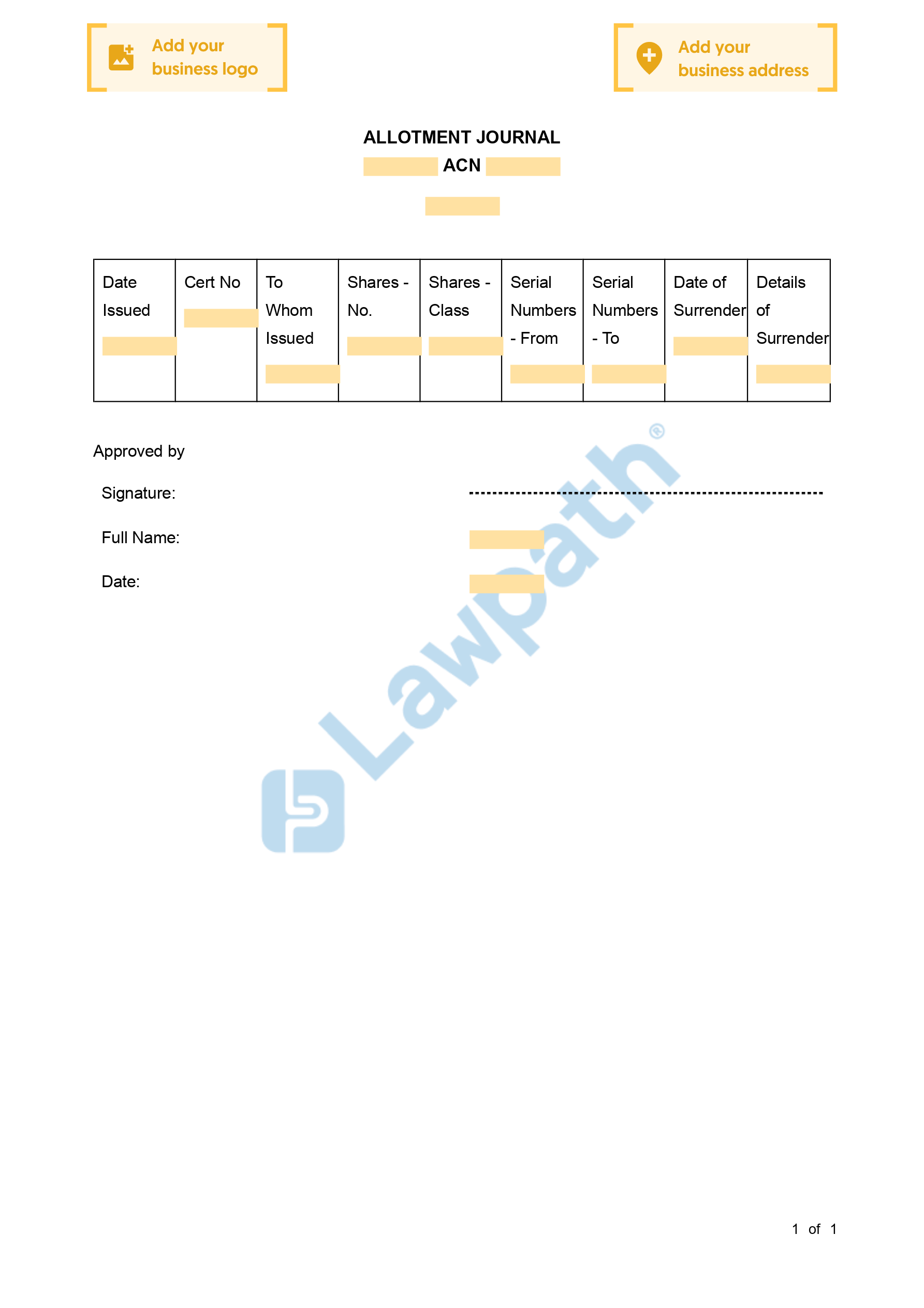 An Allotment Journal is a document that records the allocation of shares in a company to its shareholders.