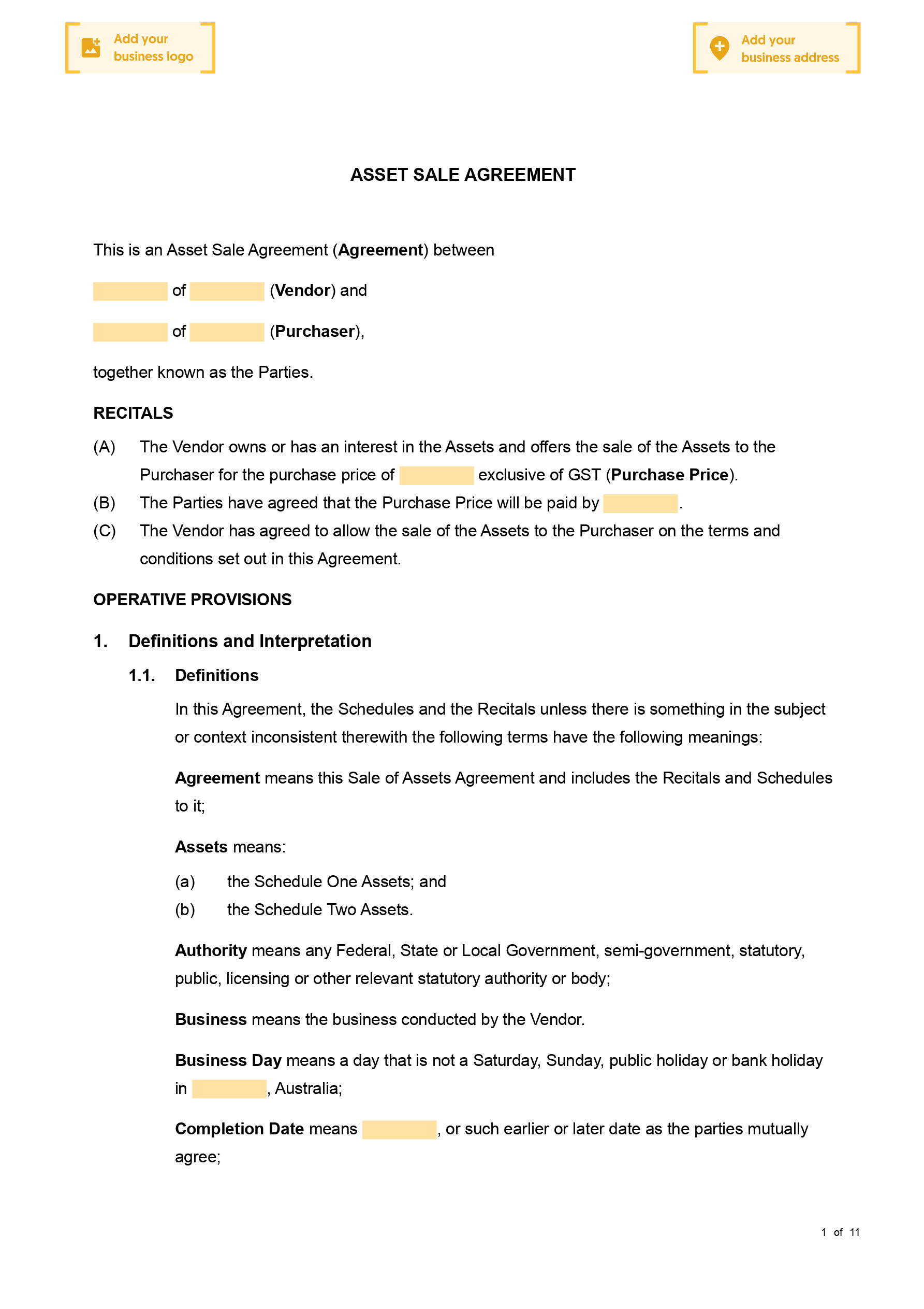Complete your free Asset Sale Agreement with our checklist