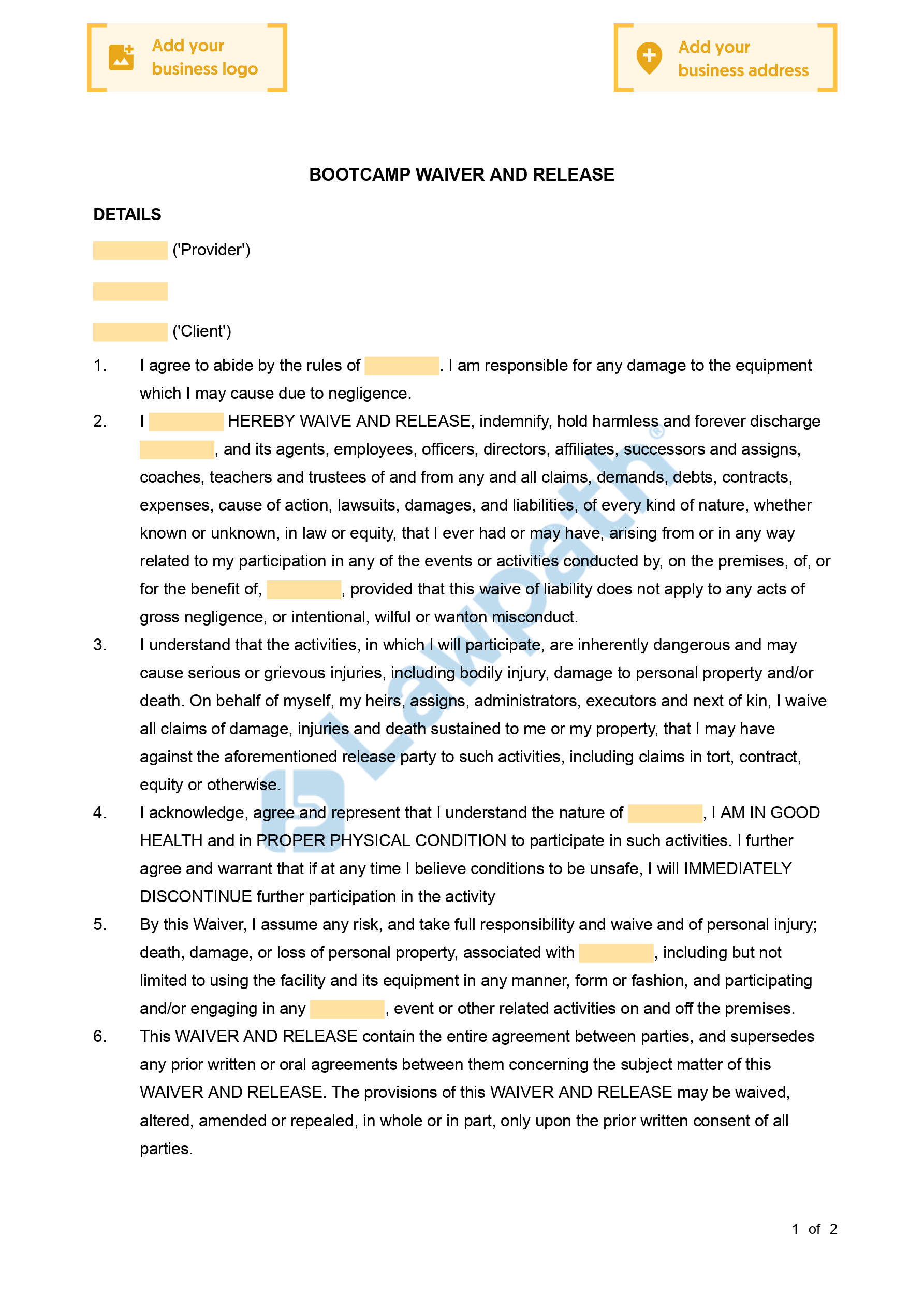 As a bootcamp operator, it is feasible that accidents or injuries may occur while customers are participating. A bootcamp waiver is a specific agreement between the customers and the bootcamp business whereby the client will give up their ability to sue if any injuries, damage or loss were to occur. The document will also outline the risks associated with the activities carried out in your bootcamp program. These risks must be acknowledged and accepted by customers prior to commencing.