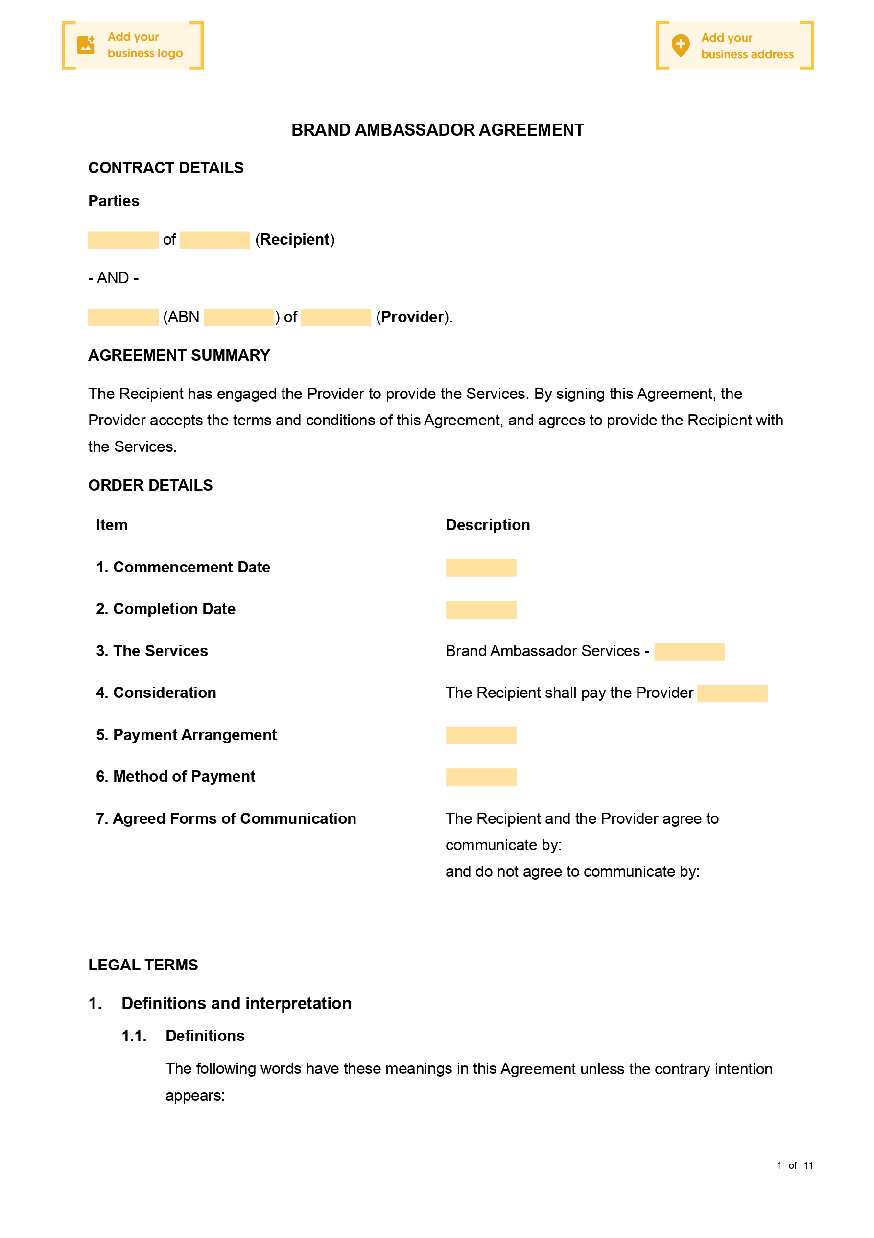 As a brand ambassador, it's important that you have the right documents in place to make sure your services are delivered effectively, and even more importantly, that you get remunerated for those services. A Brand Ambassador Agreement sets out the terms and conditions between you as the service provider and the recipient of your services. If you are providing brand ambassador services, you need to set out the terms and conditions of those services.