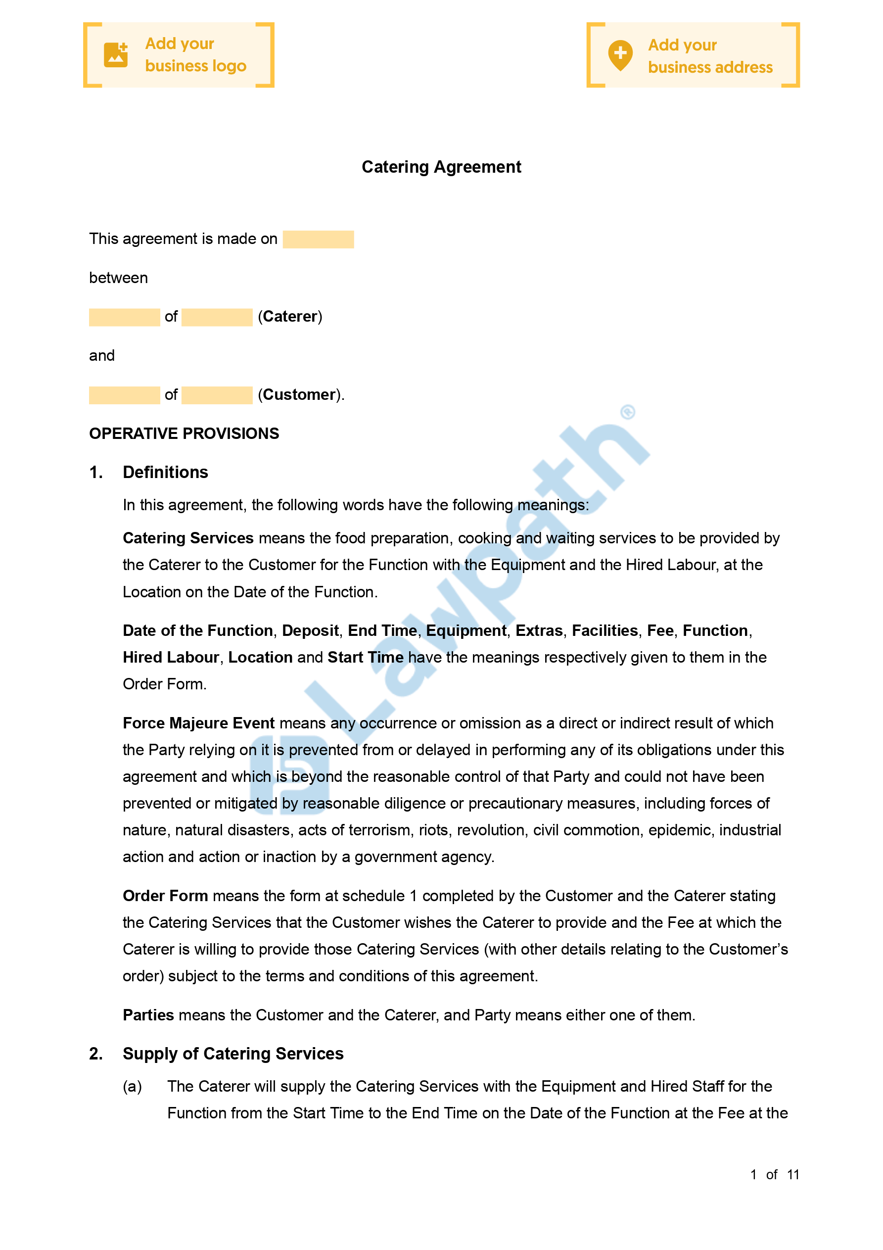 This Catering Agreement (Customer is a Business) establishes an agreement for the purpose of a caterer providing one-off catering services for a specific event, occasion or function, where the customer is a business.