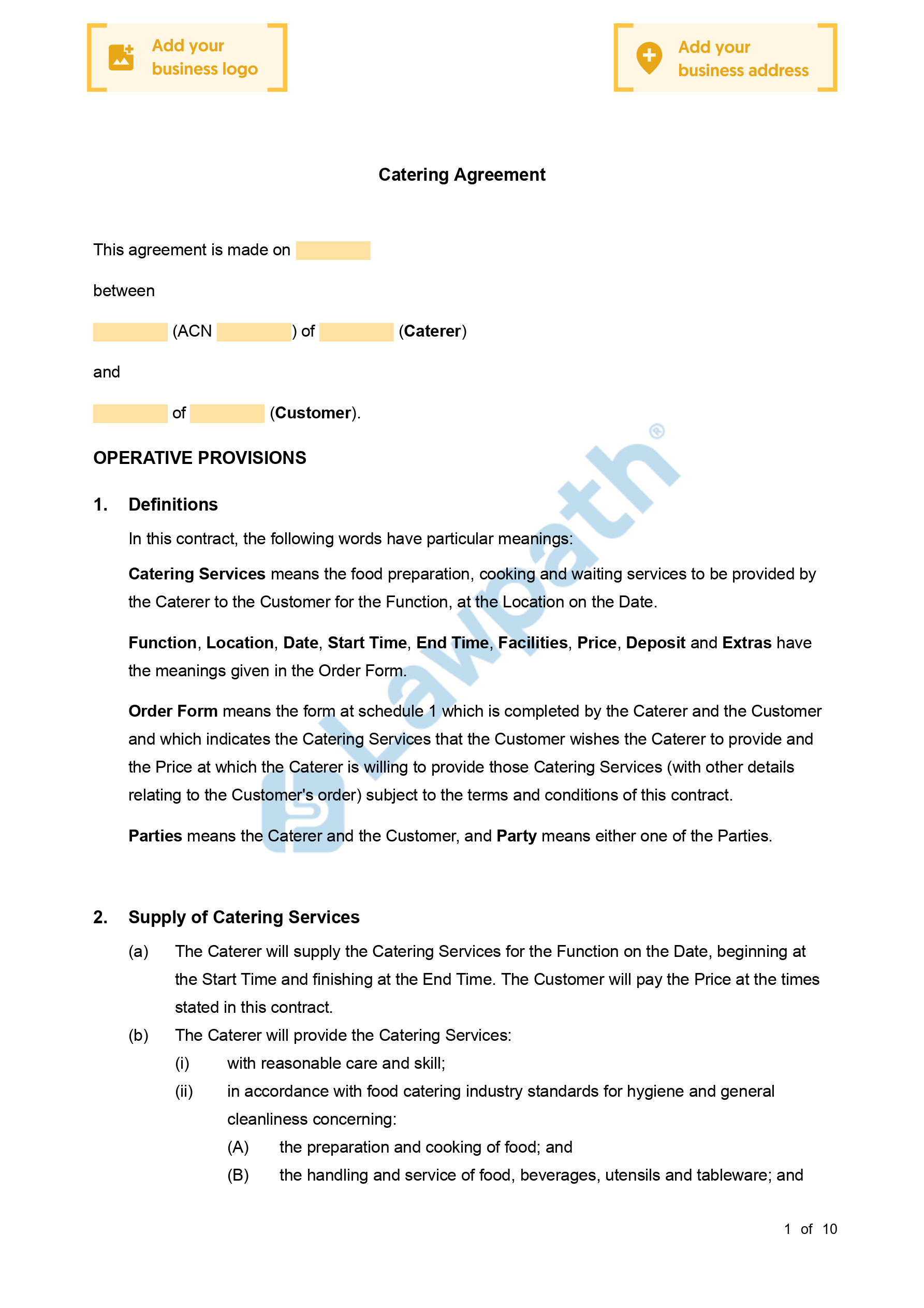 The language is designed for easy reference and understanding by a consumer. The caterer providing the services may utilise this precedent as a workable, flexible tool to use with a variety of consumer customers, with the comfort that all the necessary terms and conditions are contained within it.
