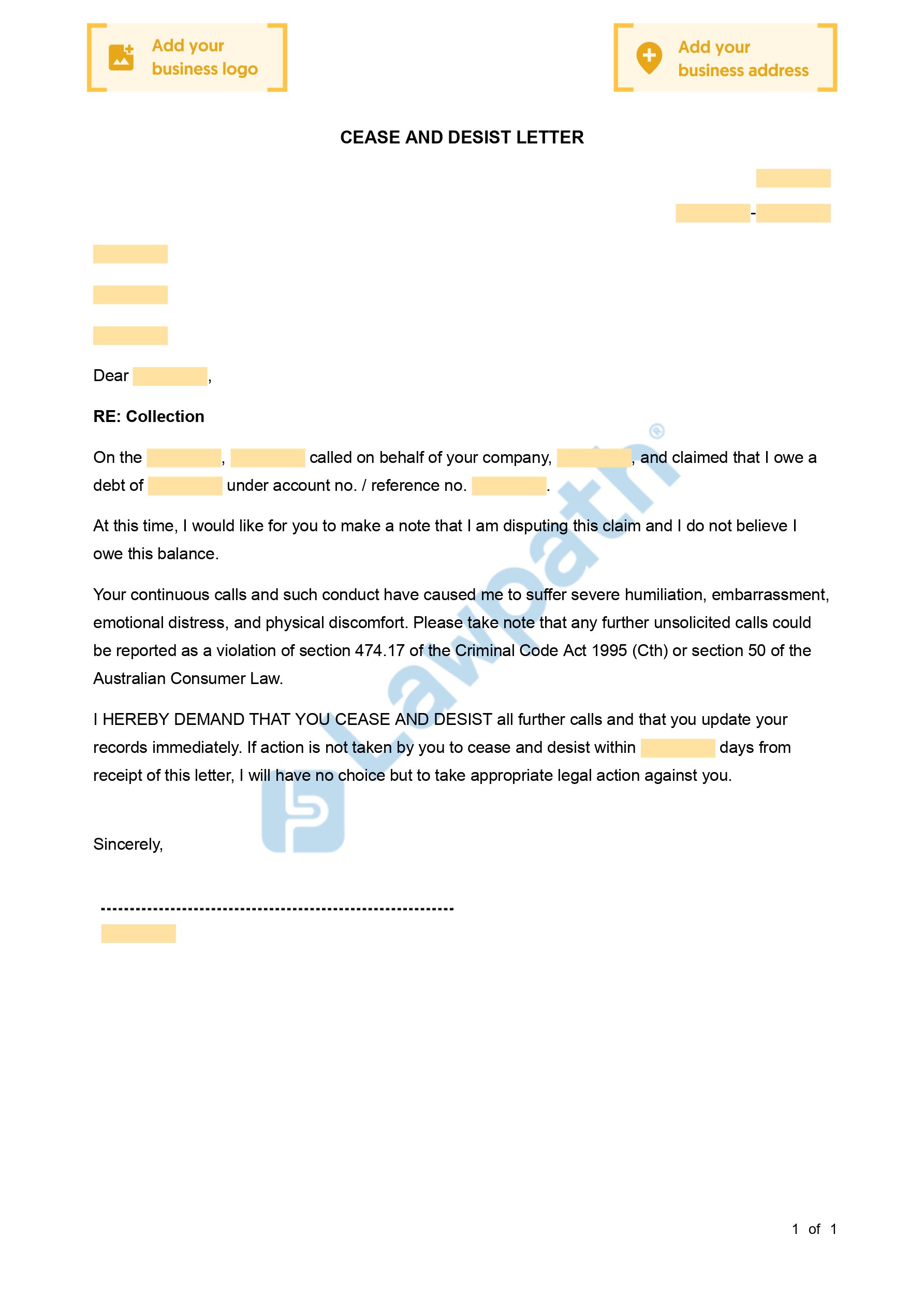 This is a variation of a Cease and Desist letter designed to be sent to debt collectors to formally request they stop contacting a debtor (a person or enterprise who owes money). Australian Consumer Law outlines that a debt collector is not allowed to act unconscionably towards a debtor, including harass, deceive or contact them outside of reasonable hours.