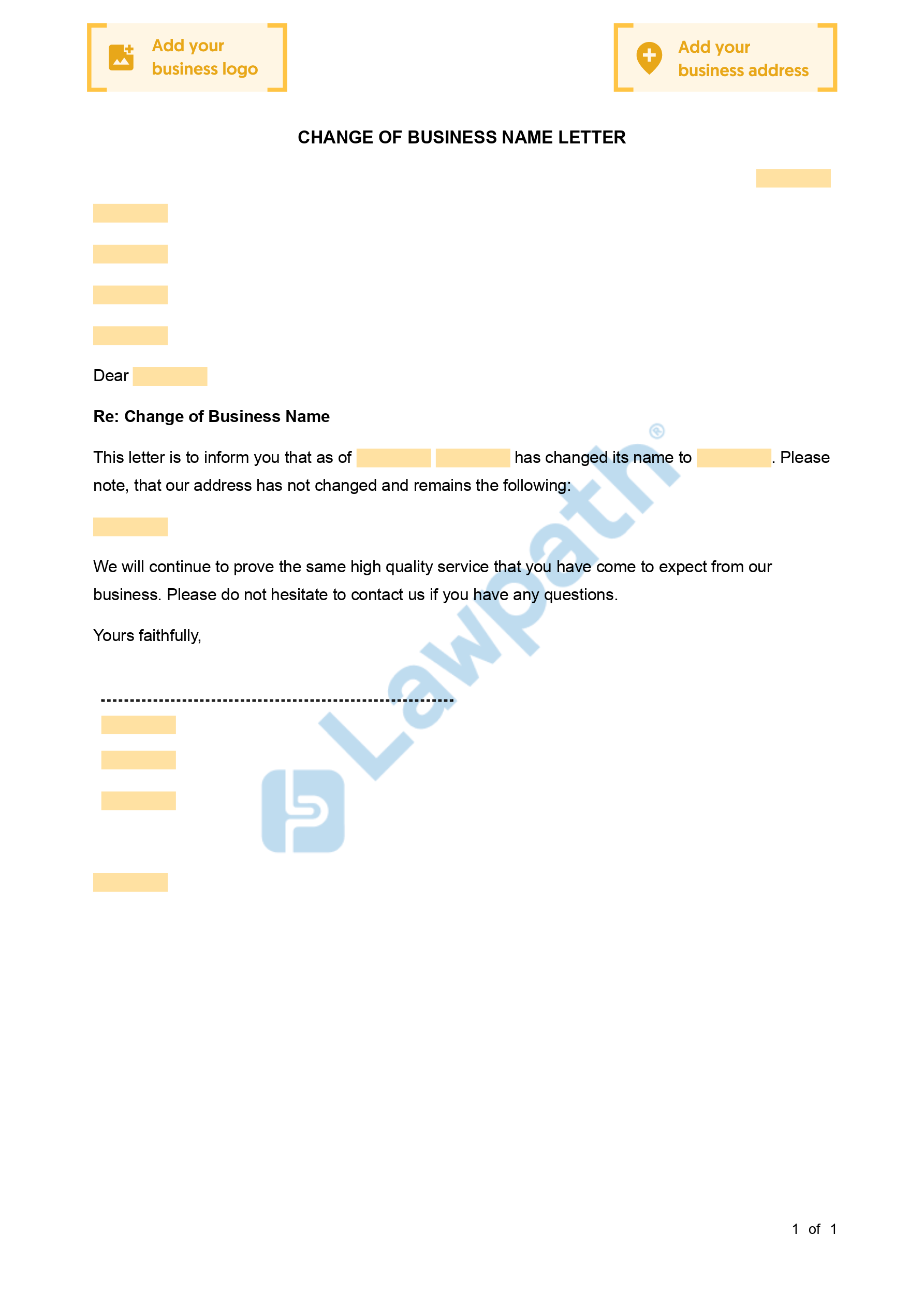 Create a quality document of change of Name (Business) to notify the sole traders, partners or the board using instant document builder of Lawpath. Draft yours now!