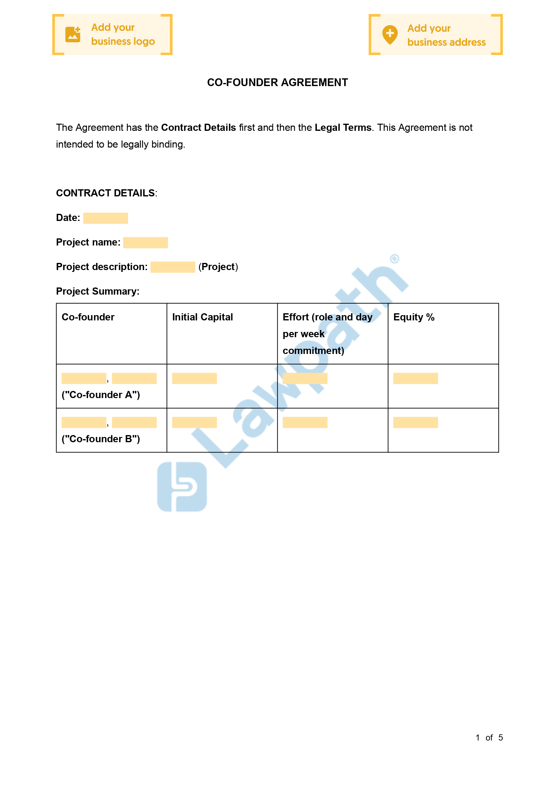 A Co-Founder Agreement allows you to set out the equity ownership, initial investments and responsibilities of each co-founder. It is a non-binding agreement.