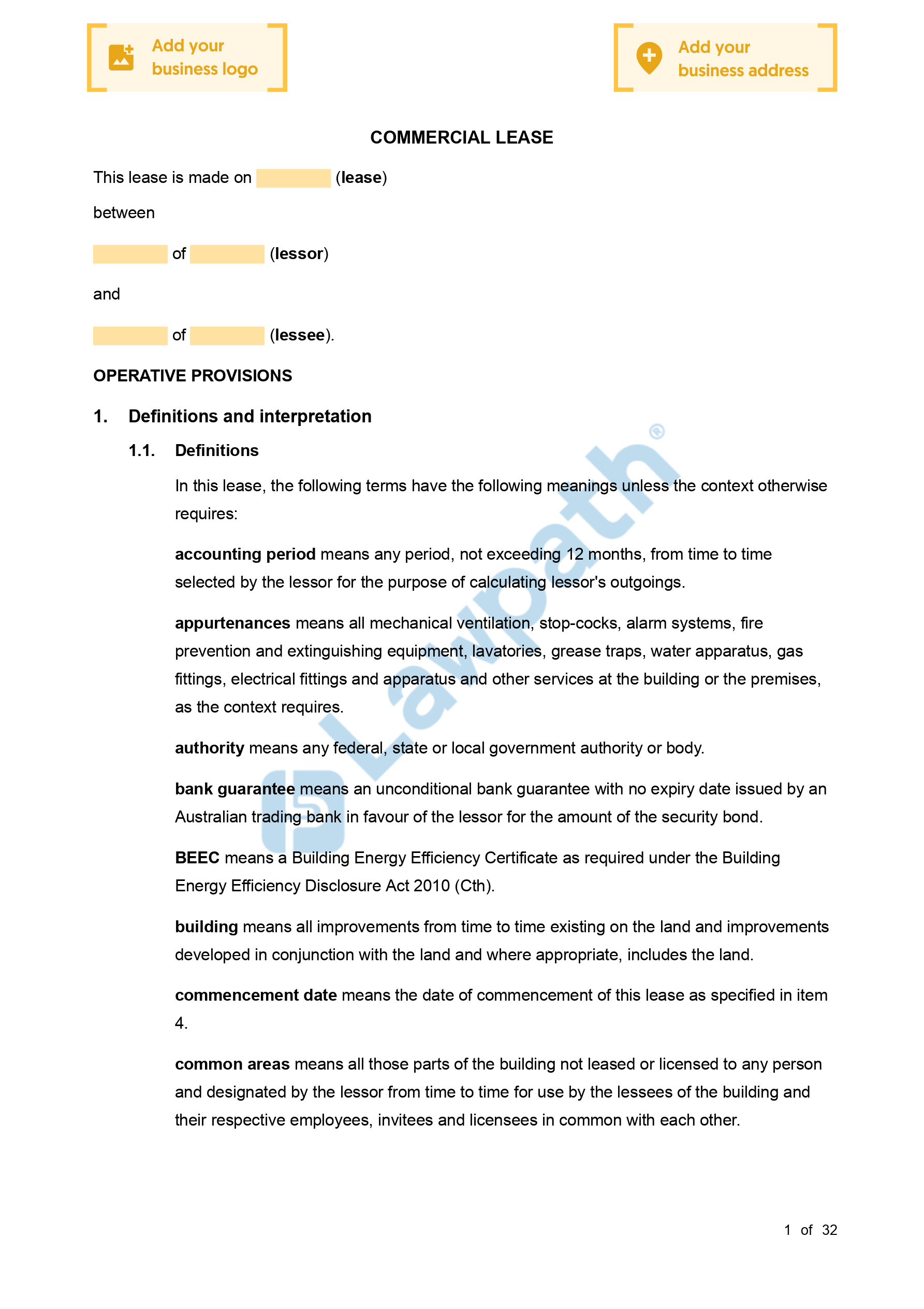 It is important to note that this Commercial Lease Agreement (Non-Retail) is NOT designed for retail leases. This is because retail leases generally have more restrictions than commercial leases, and that some commercial properties can only be rented through a retail lease and not a commercial lease. By way of an example, retail shops and similar businesses will usually require a ‘retail lease’. Whereas, other commercial properties such as factories, warehouses or scrap yard will likely require a ‘commercial lease’.