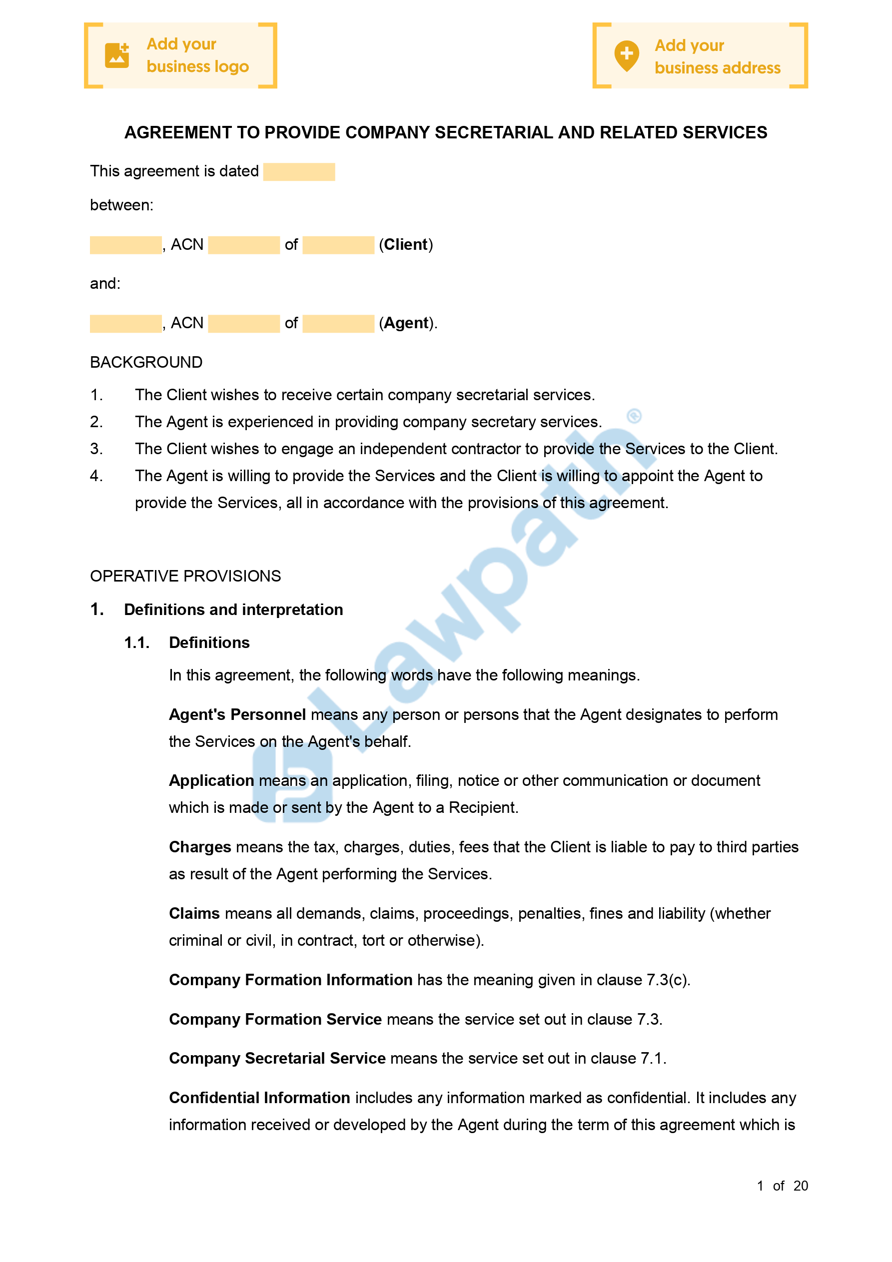 This Company Secretarial Services Agreement can be used to set out the general terms between a client and agent providing company secretarial and related services.