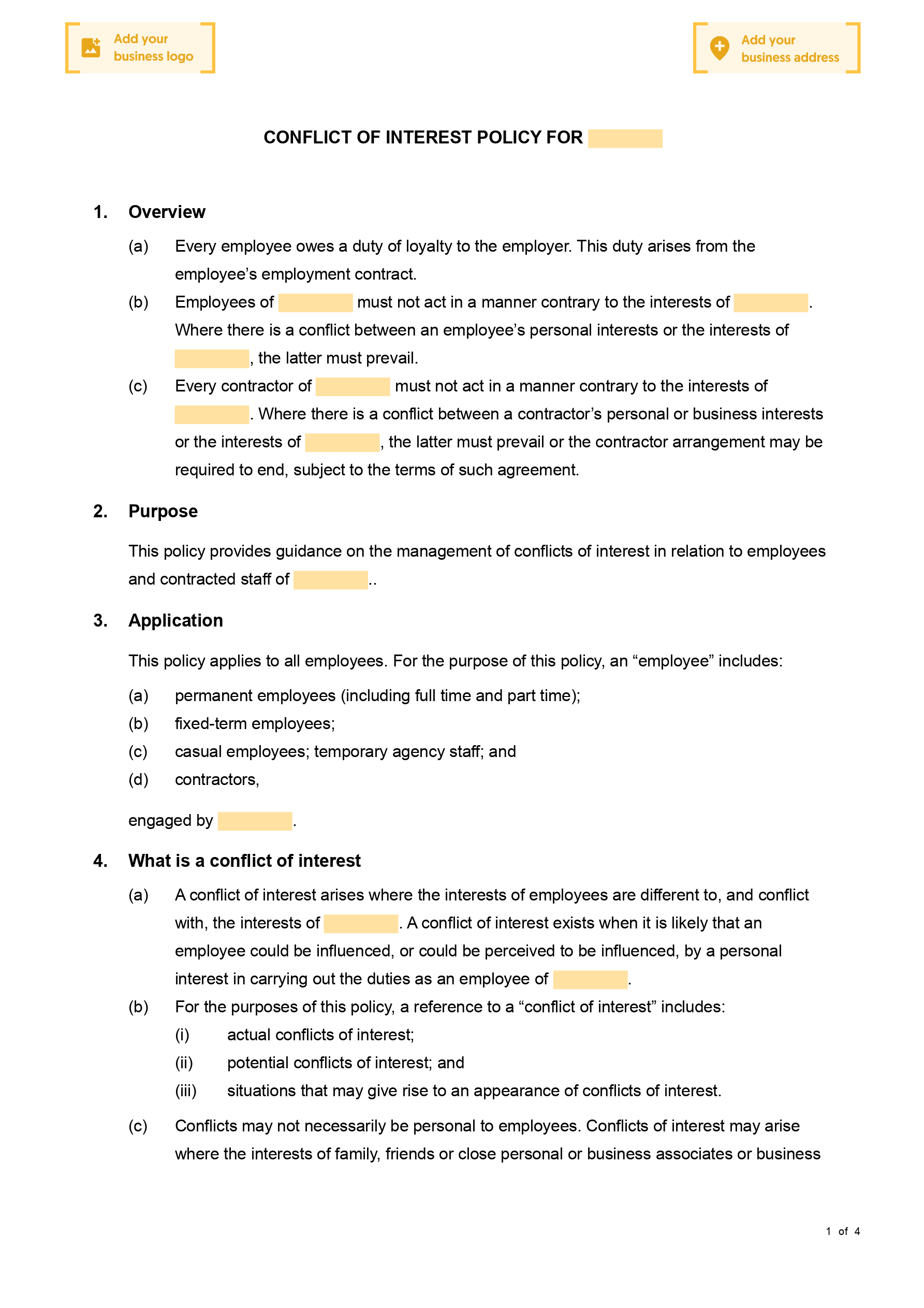 A Conflict of Interest Policy outlines the process for the disclosure of any conflicts of interest that your employees may have. Using this policy helps protect your Company by ensuring that you are aware of any circumstances that may create a conflict of interest, and can address these before they can damage your company or expose you to a breach of the law.