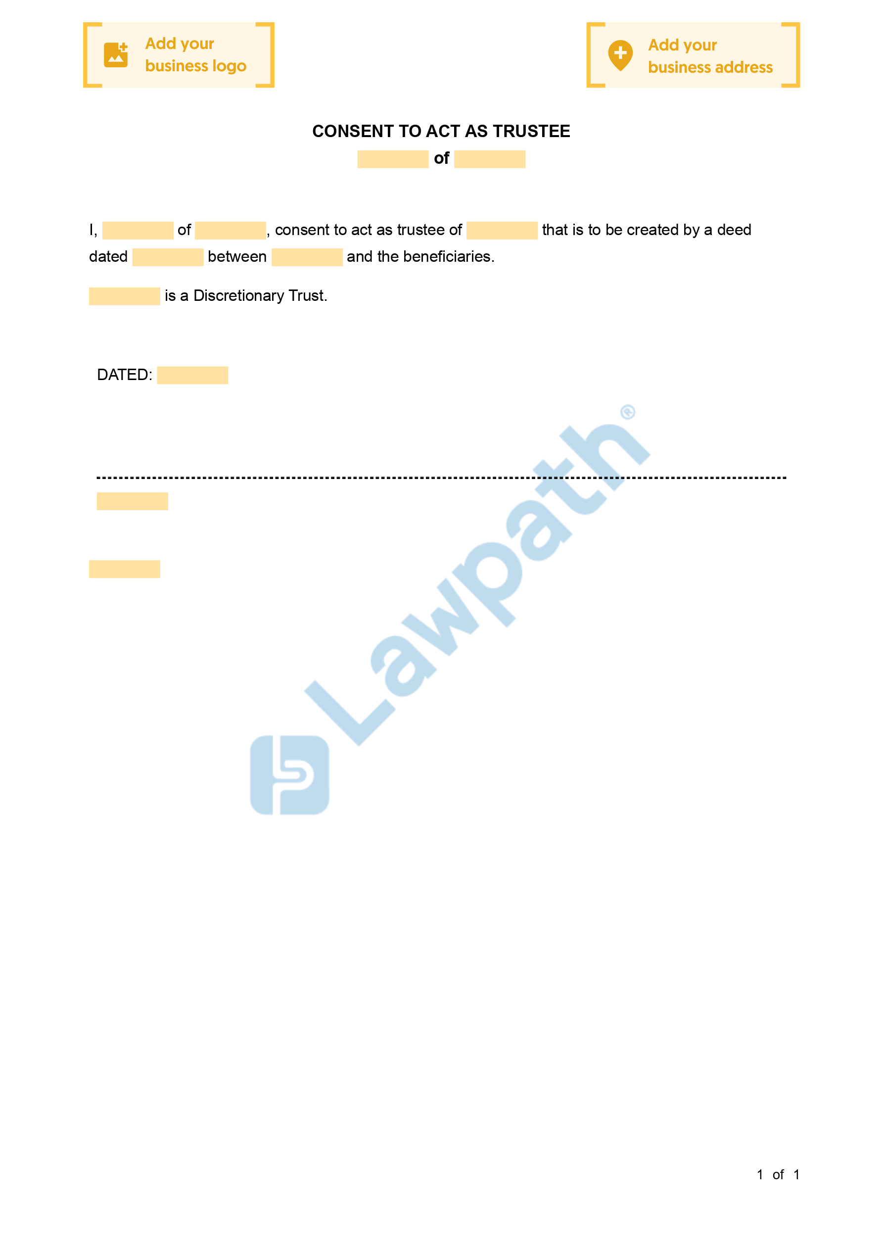This Consent to Act as a Trustee (Discretionary Trust) is required to ensure that the trustee of the trust has given consent to take on this responsibility.