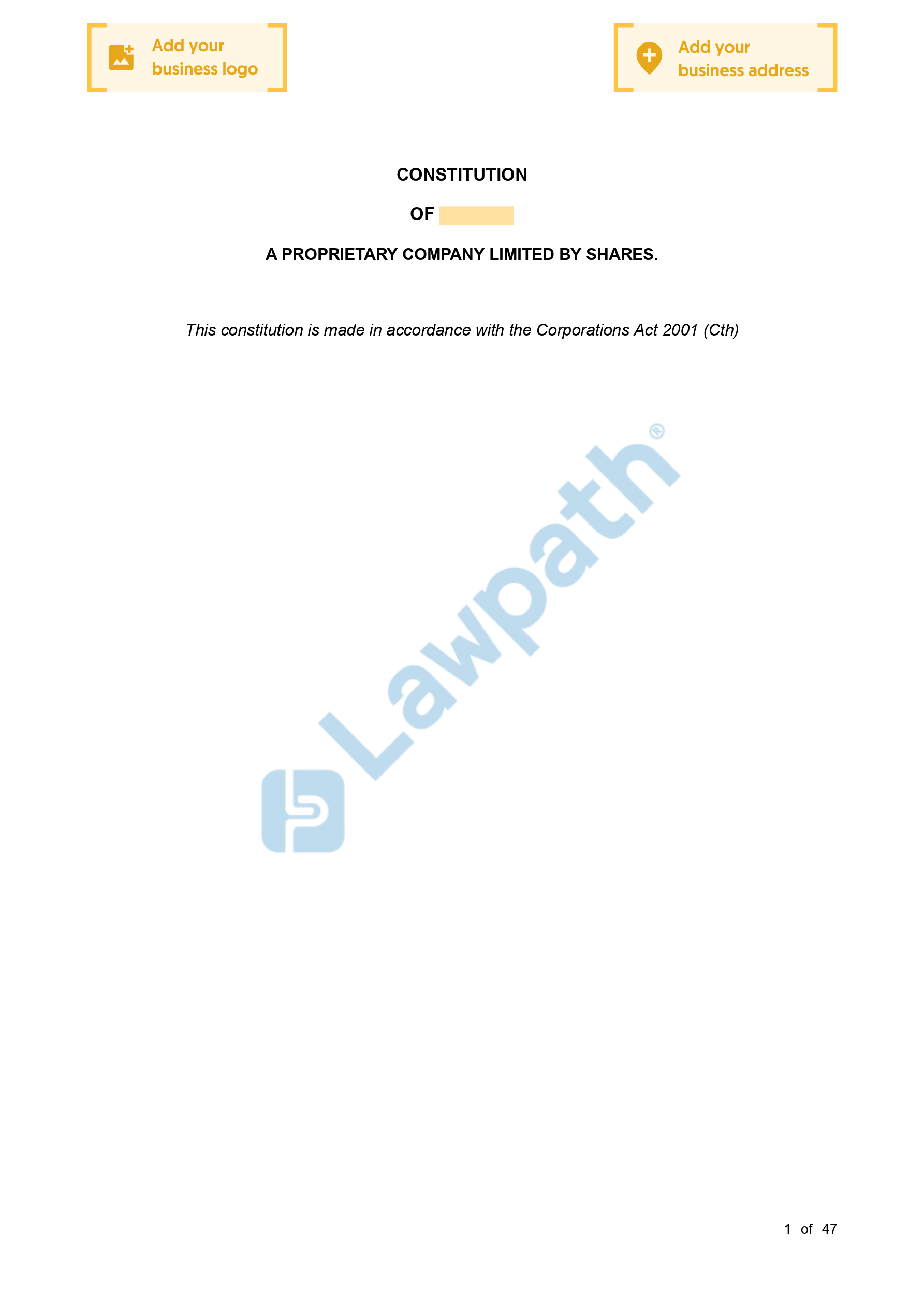 A constitution is an essential and crucial document that oversees the activities of your company as well as the relationship of your company’s directors and shareholders. Company constitutions specify the rules governing the directors and shareholders in relation to the operations of a company. This constitution is drafted for a proprietary company limited by shares. Public company constitutions must follow different rules.