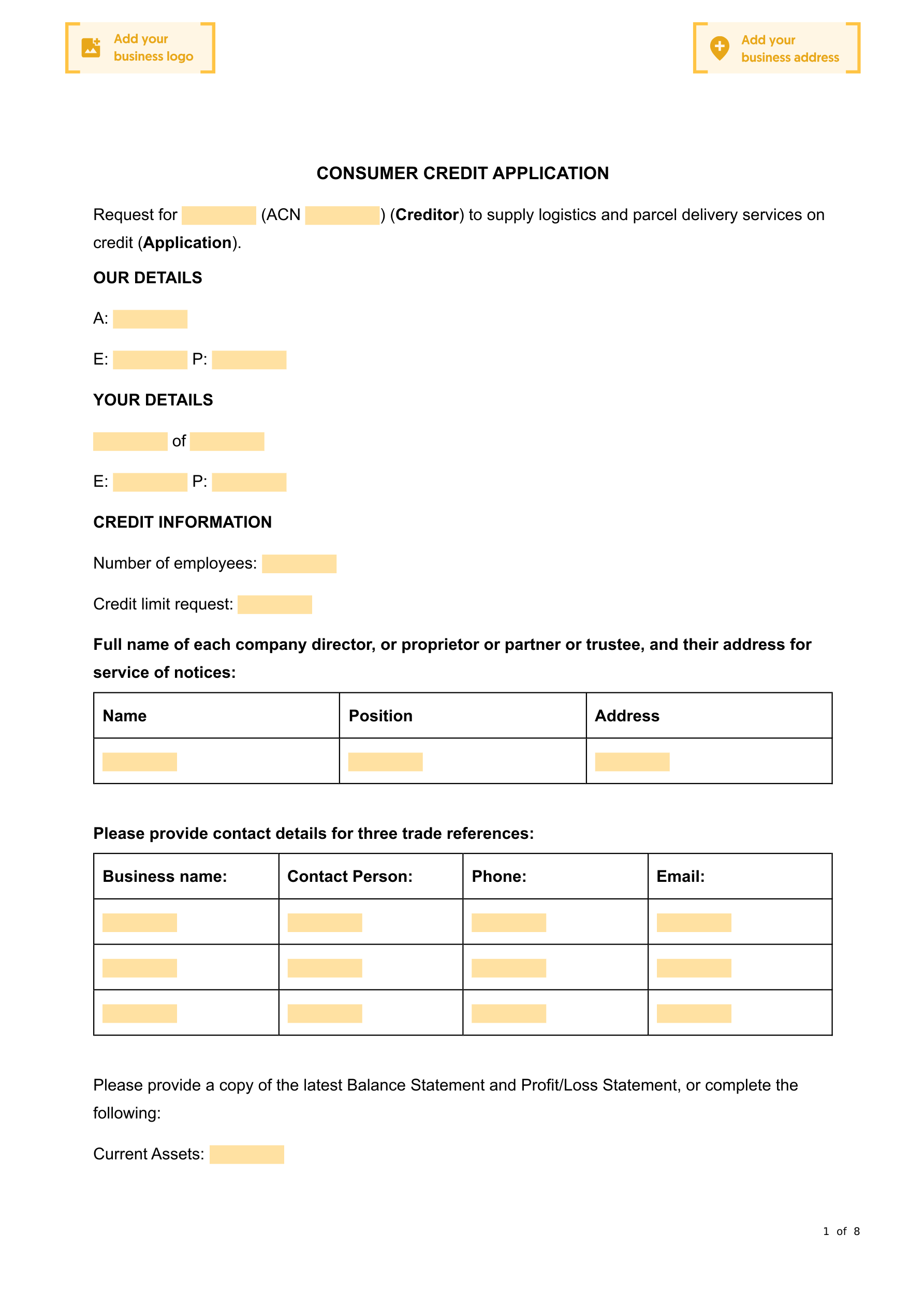 This Consumer Credit Application provides both an application form and terms and conditions for services to be provided on credit.