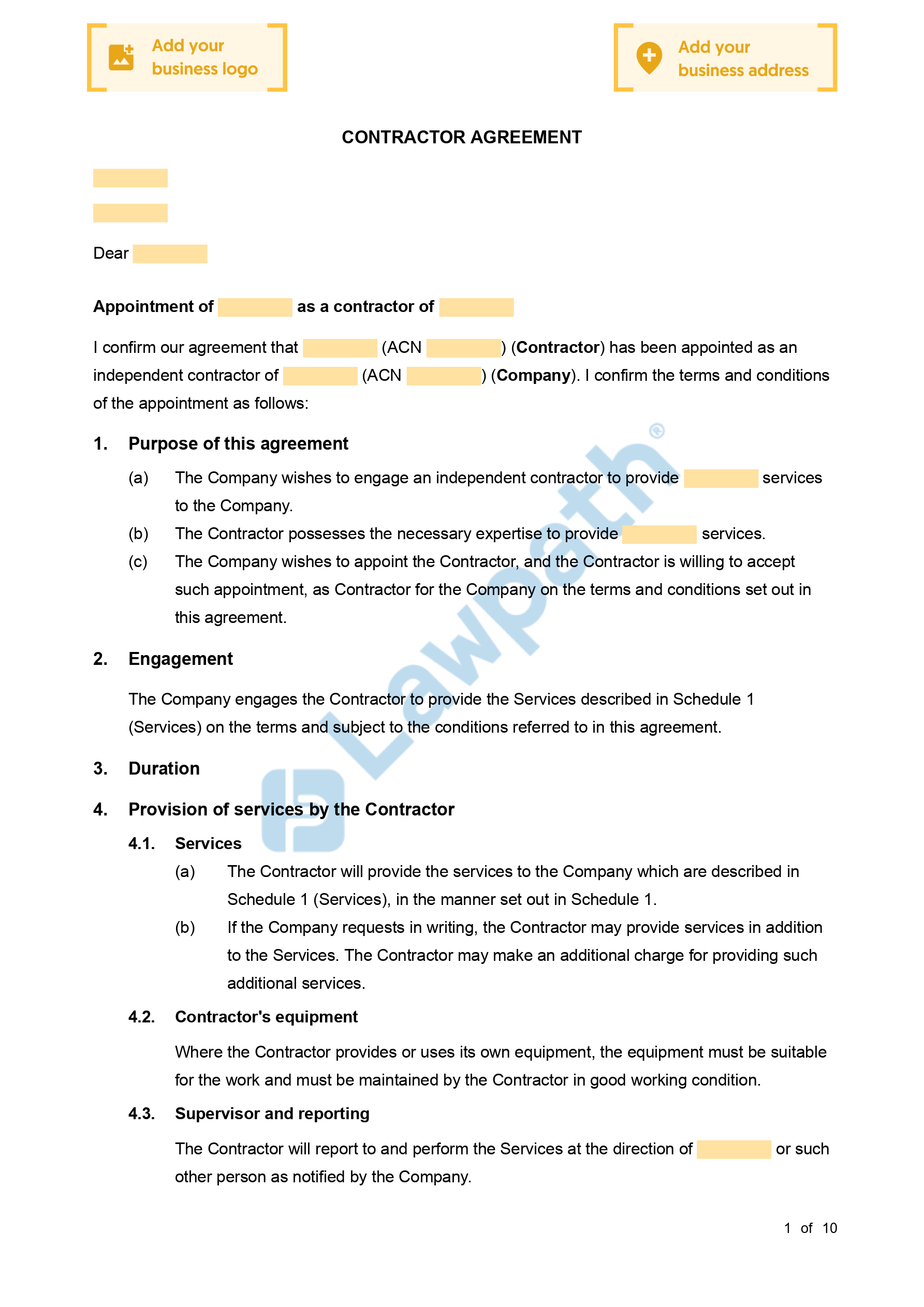 A Contractor Agreement (Company) allows you to engage a contractor that is a company.
