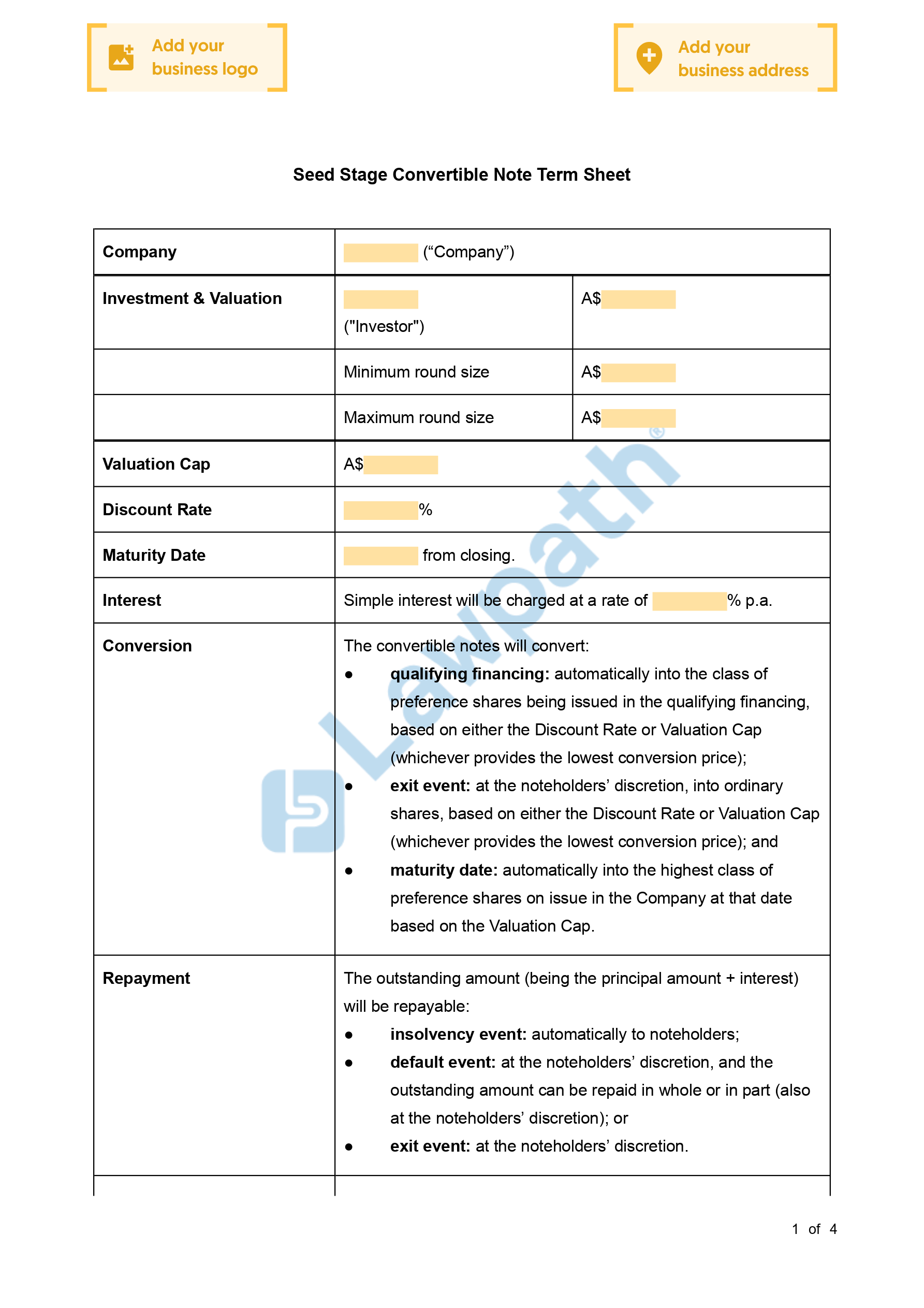 A Convertible Note Term Sheet establishes the general terms of an investor joining your business on a convertible loan basis.