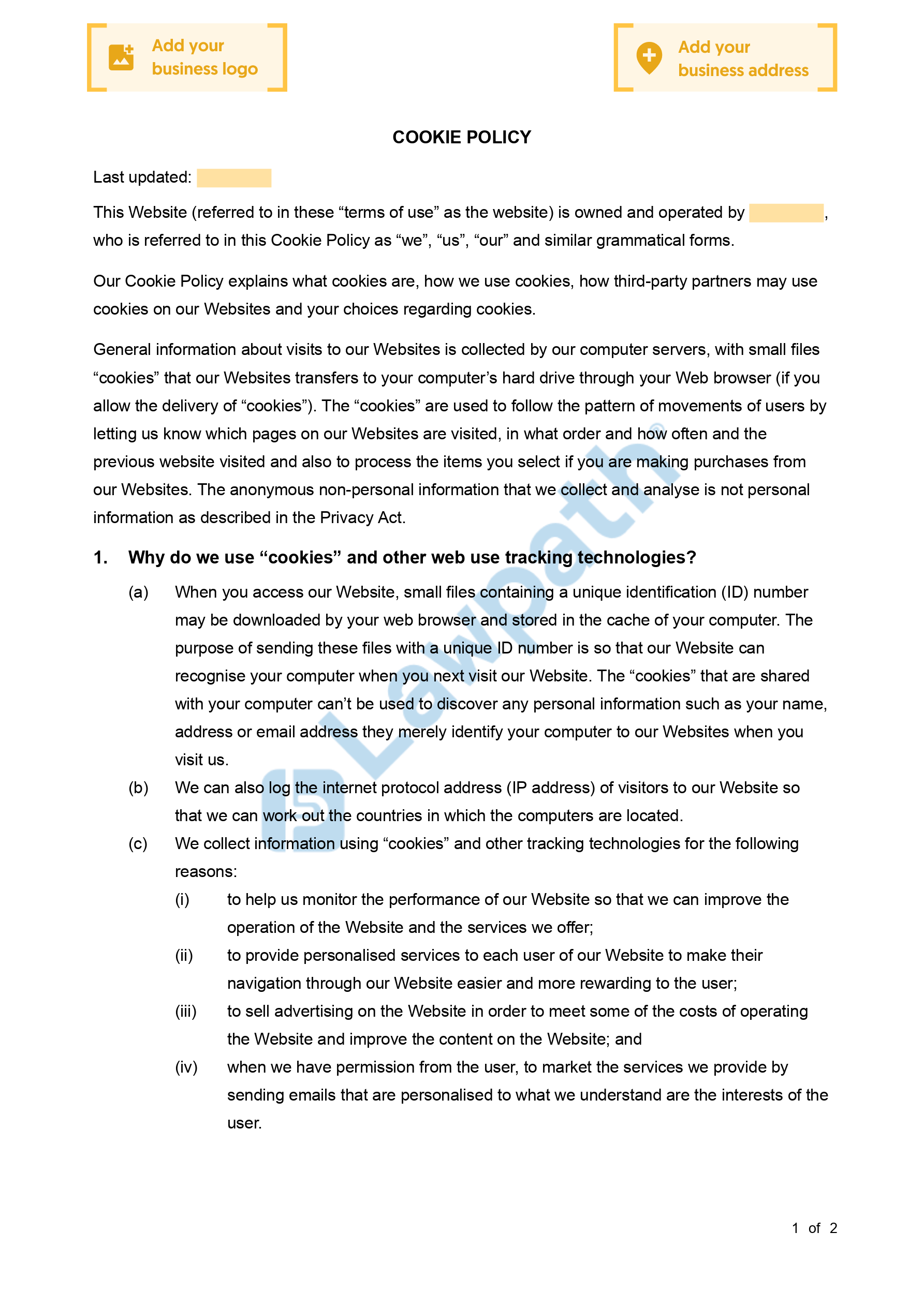 Cookies are small data files which are downloaded onto a computer when a website is visited for the first time. Many website owners choose to incorporate the cookie policy as a section of their privacy policy. You can also leave your website cookie policy as a stand-alone section. This document is drafted to be compliant with Australian legislation. Therefore, this document may not be compliant with the EU General Data Protection Regulation (GDPR).
