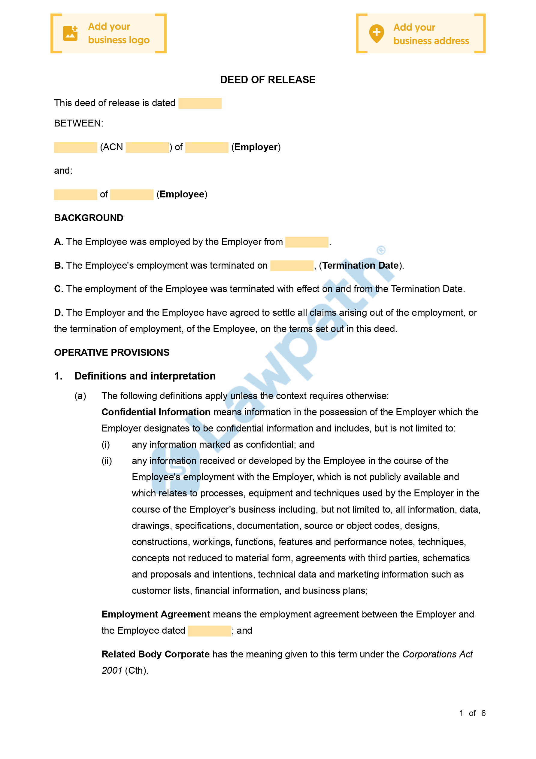 A Deed of Release is a formal document entered into between two parties when settling a dispute or to prevent one from occurring. It is a legal document that releases parties from their previous obligations and it is commonly used for settling transfer of title for property and when an employee leaves a company. A Deed of Release entitles an employer to release you from obligations in exchange for ex-gratia payments (i.e. lump sum payment) to the employee. It is used by employers to bar employees from bringing employment-related claims against them, an unfair dismissal claim or any other relevant claims.
