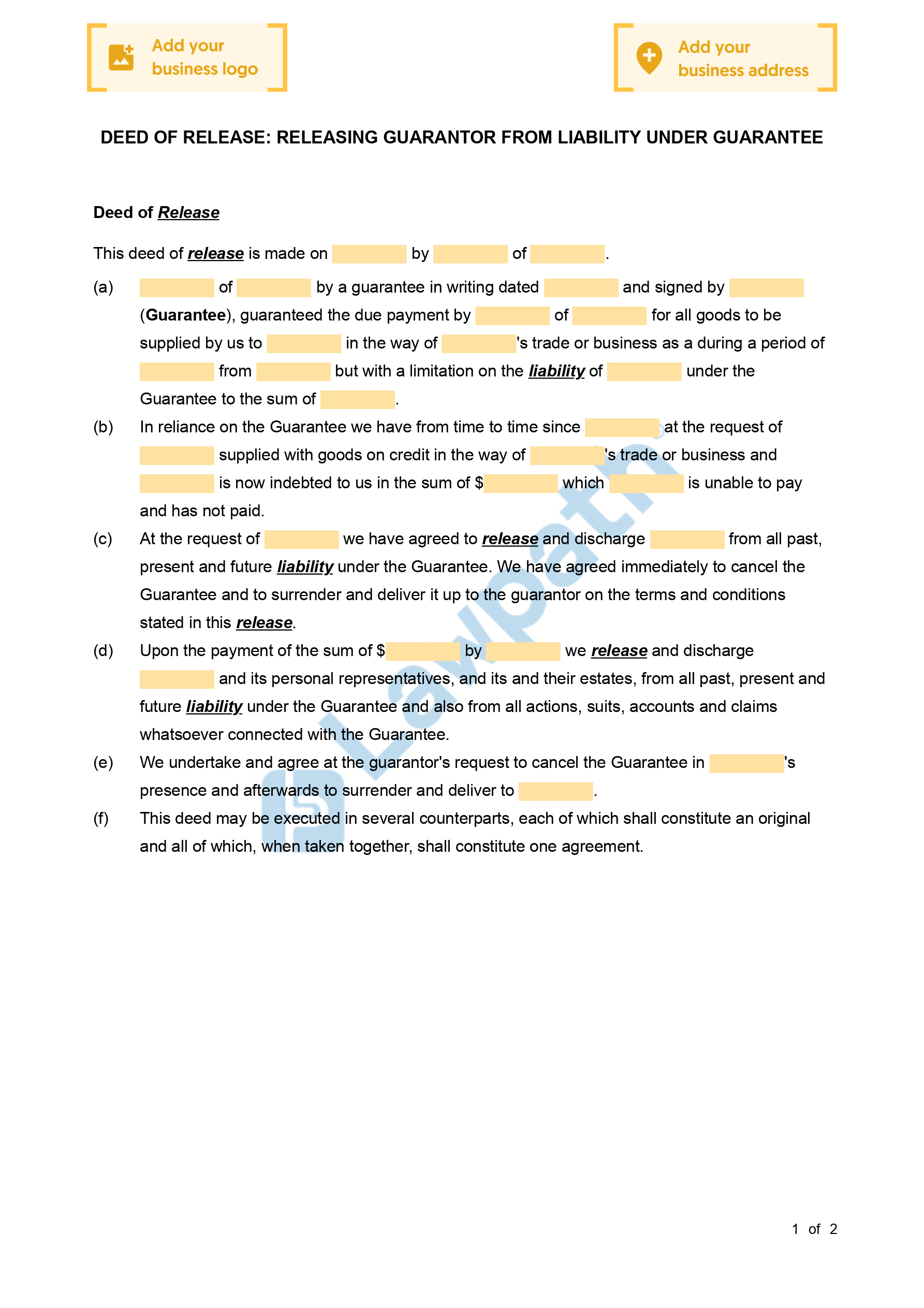 This Deed of Release is entered when the parties agree to release a guarantor who made a guarantee to secure a debt or a transaction.