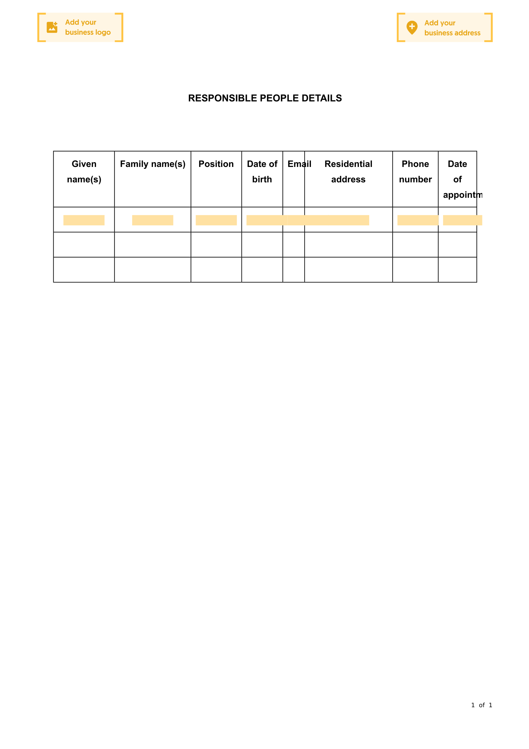 This Details form can be used to keep the details of a not for profit organisation's responsible people so they can be submitted to the ACNC.
