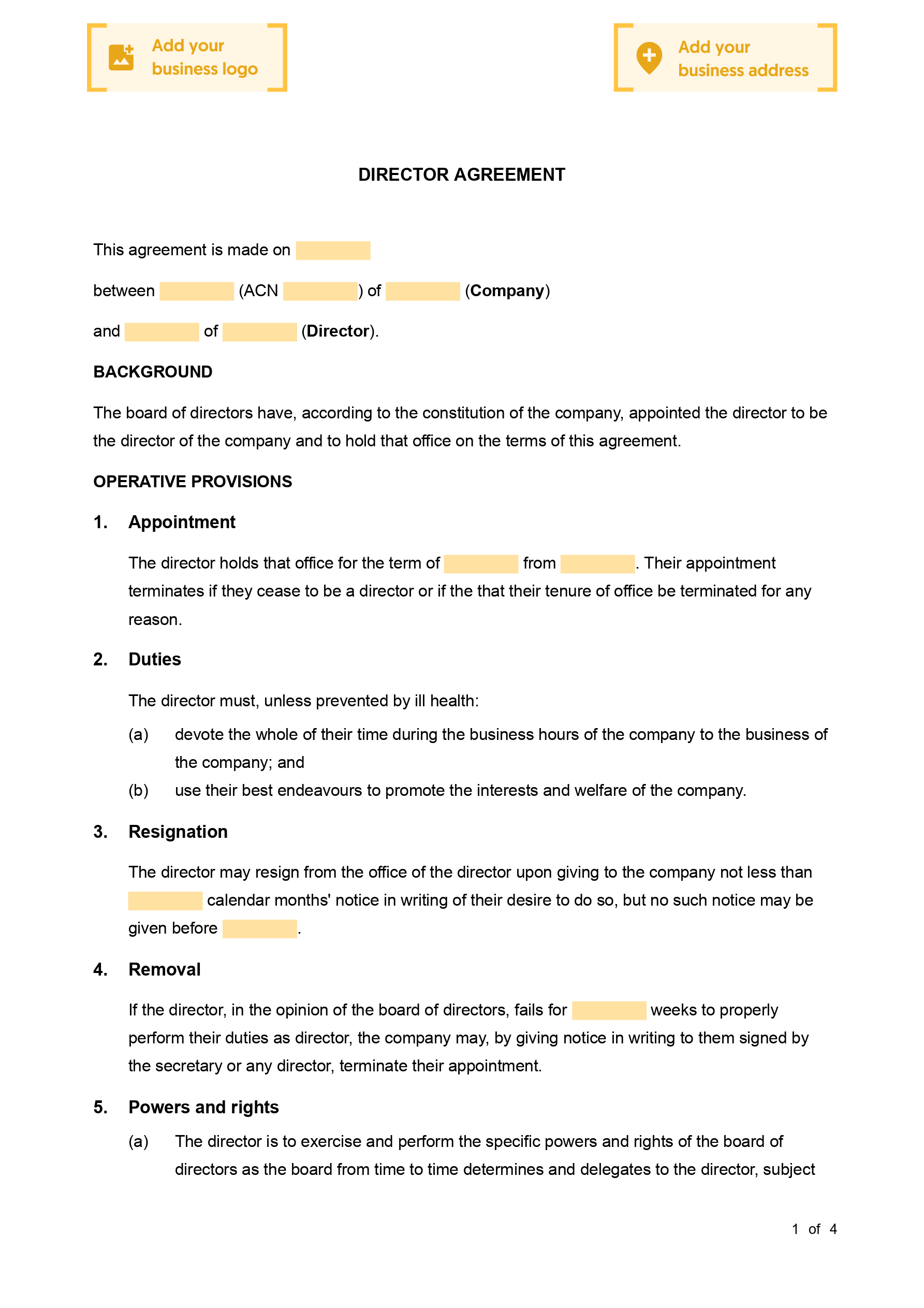 This is not an employment agreement, as directors are not legally considered employees solely through their role as officers of the company. This means that the rights of directors are more akin to those of contractors. However, a director may also be an employee if they are actively involved in the operation of the company, such as those who hold c-suite positions. This is generally referred to as an executive director, and we recommend using a separate document for this arrangement, such as Lawpath’s Executive Agreement.