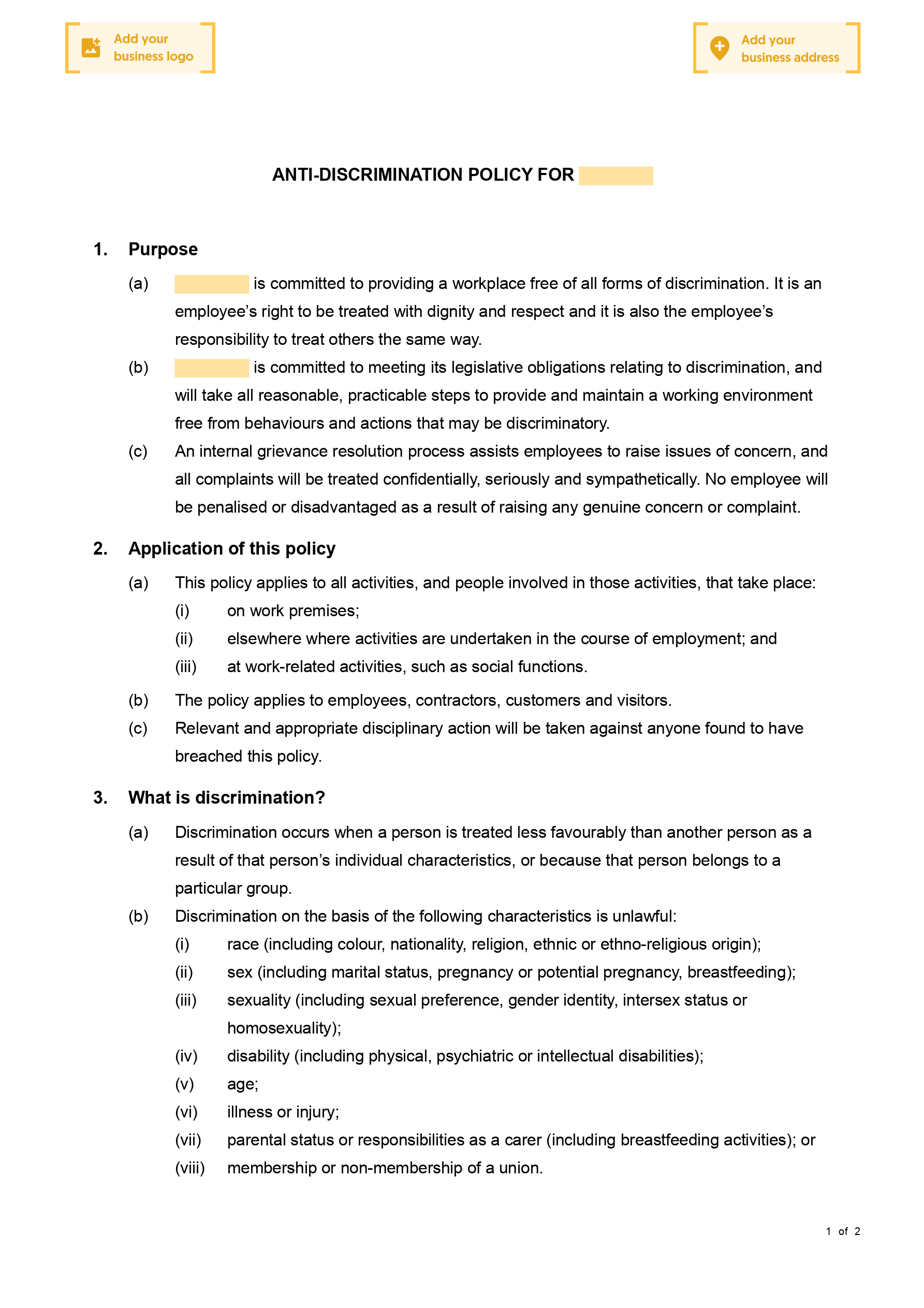 This Discrimination Policy can be used to show your commitment to providing a workplace free of discrimination. This Policy defines what constitutes discrimination and provides a process for employees to flag any related complaints or grievances.