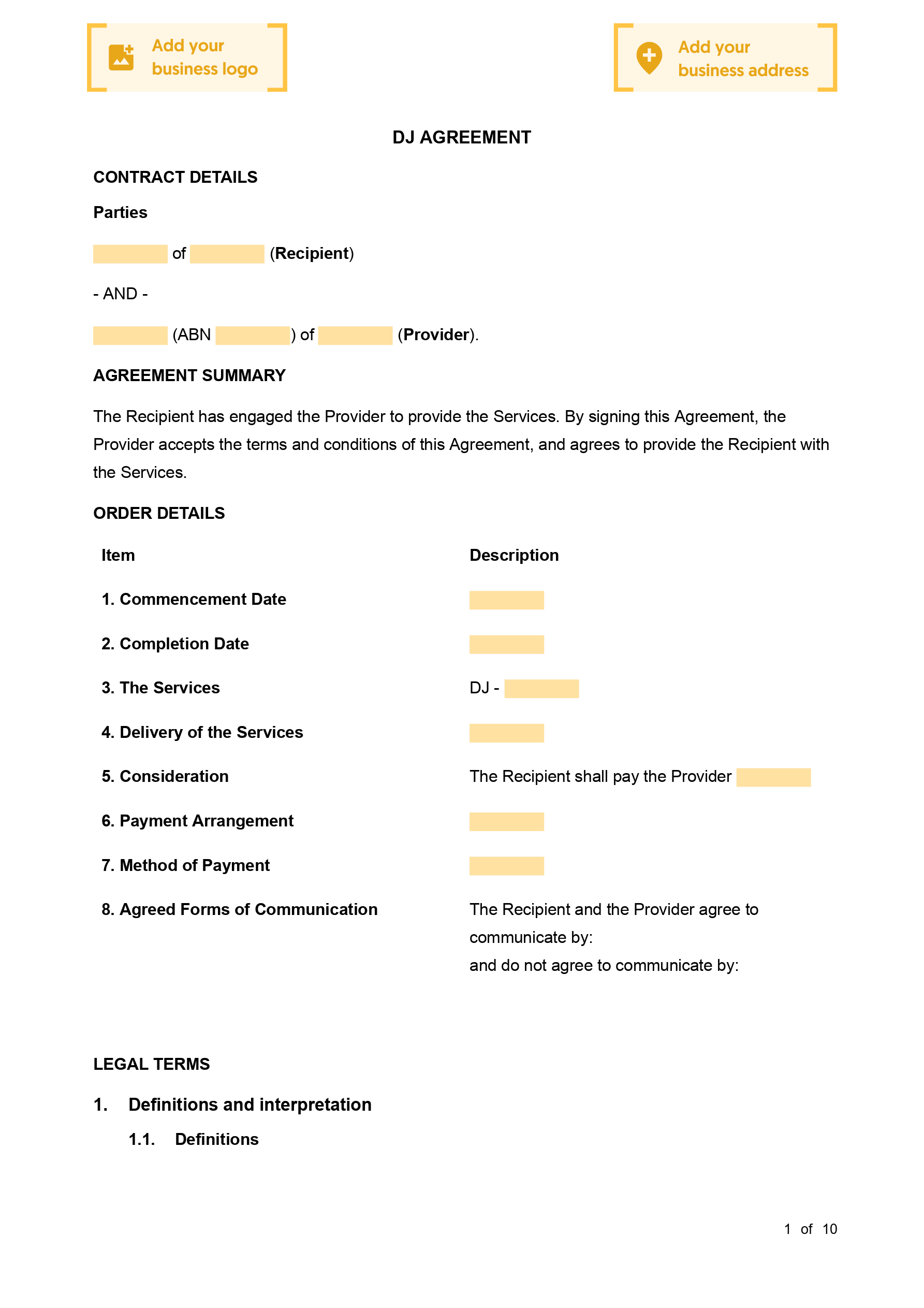 As a DJ, it's important that you have the right documents in place to make sure your services are delivered effectively, and even more importantly, that you get remunerated for those services. A DJ Agreement sets out the terms and conditions between you as the service provider and the recipient of your services. If you are providing DJ services, you need to set out the terms and conditions of those services.