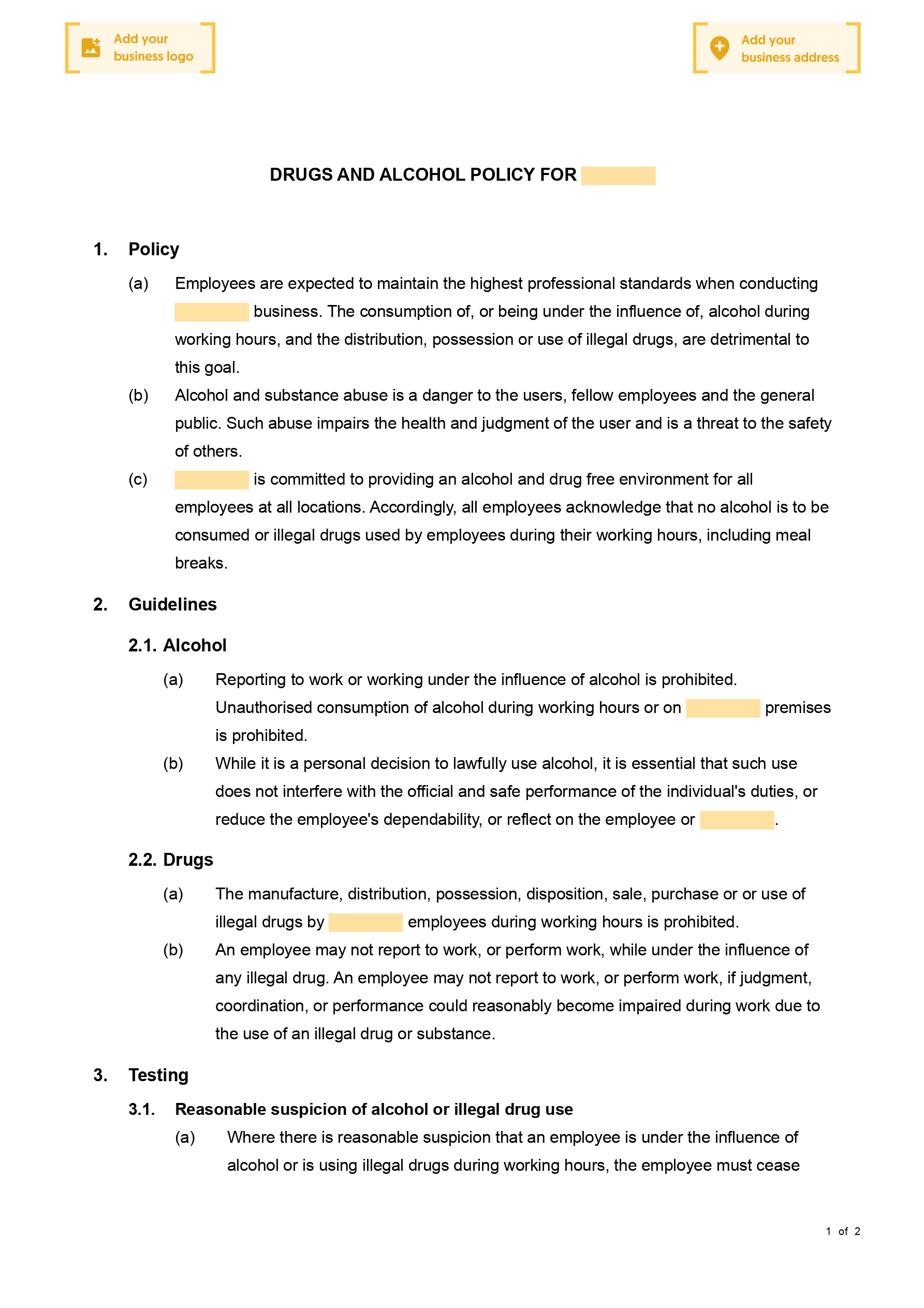 You can use this Drugs and Alcohol Policy to ensure that your workers are aware that your Company does not allow the use of drugs, alcohol or other prohibited substances other than at approved Company or social events. Using this policy can also protect your Company and provide a safer workplace by ensuring that all parties are aware of their obligations around the use of any substances, including disclosure obligations around prescribed medication if it affects the worker’s ability to perform their job safely or effectively.