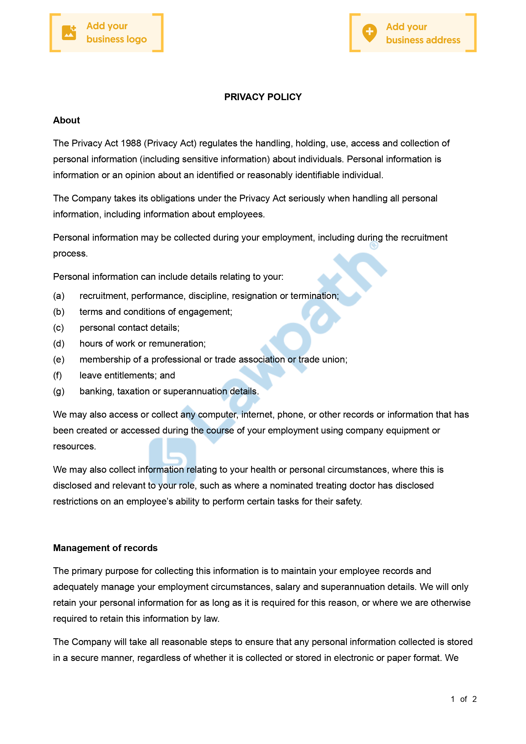 An Employee Privacy Policy is a document that outlines how a company collects, uses, and protects the personal information of its employees. This policy informs employees of their rights and to ensures that the employer handles their personal information in compliance with their obligations under the Privacy Act 1988.