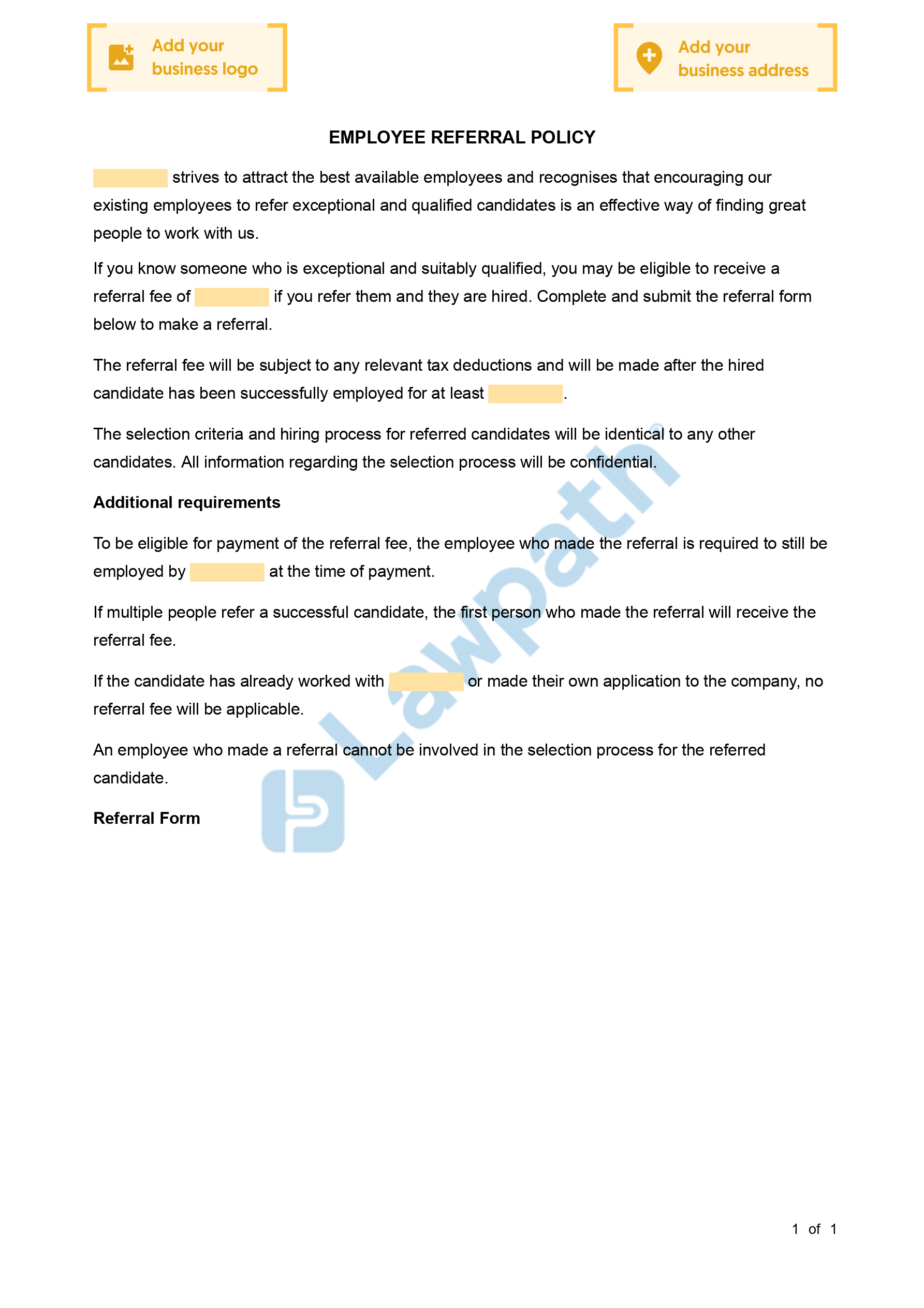 The Employee Referral Form encourages your employees to refer any exceptional and suitably qualified candidates that they know for available positions at your workplace. It also establishes the amount of any referral fee and the eligibility criteria for payment of the fee.