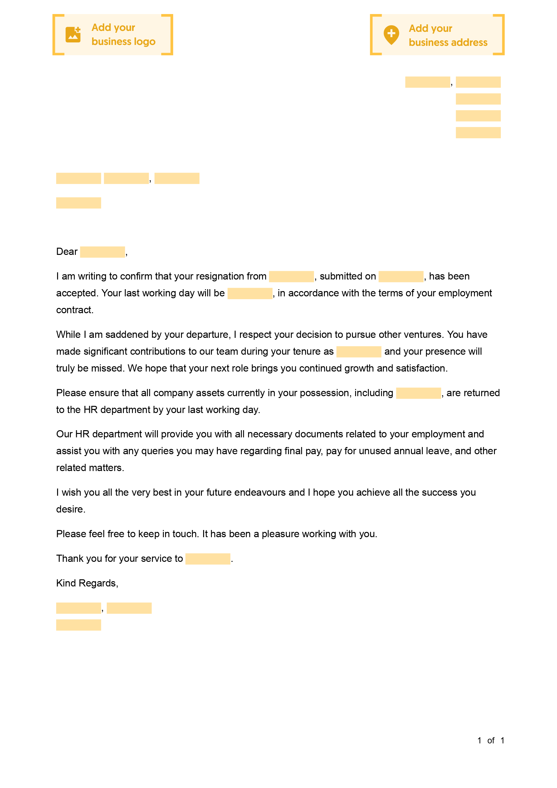 This Letter can be used to confirm a company's acceptance of an employee's resignation.