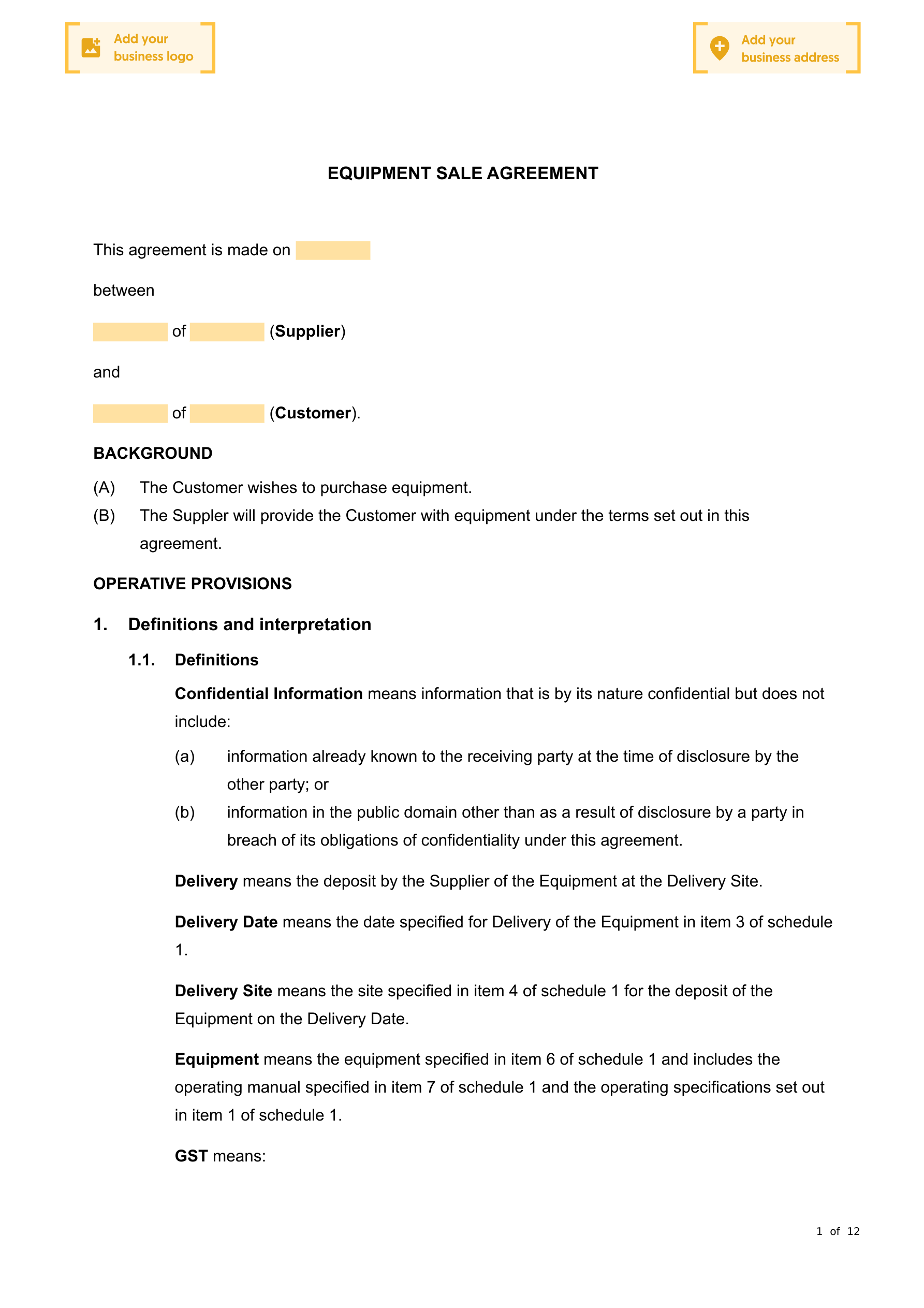 This Equipment Sale Agreement can be used for the sale and purchase of equipment. It also provides for the equipment to be installed.