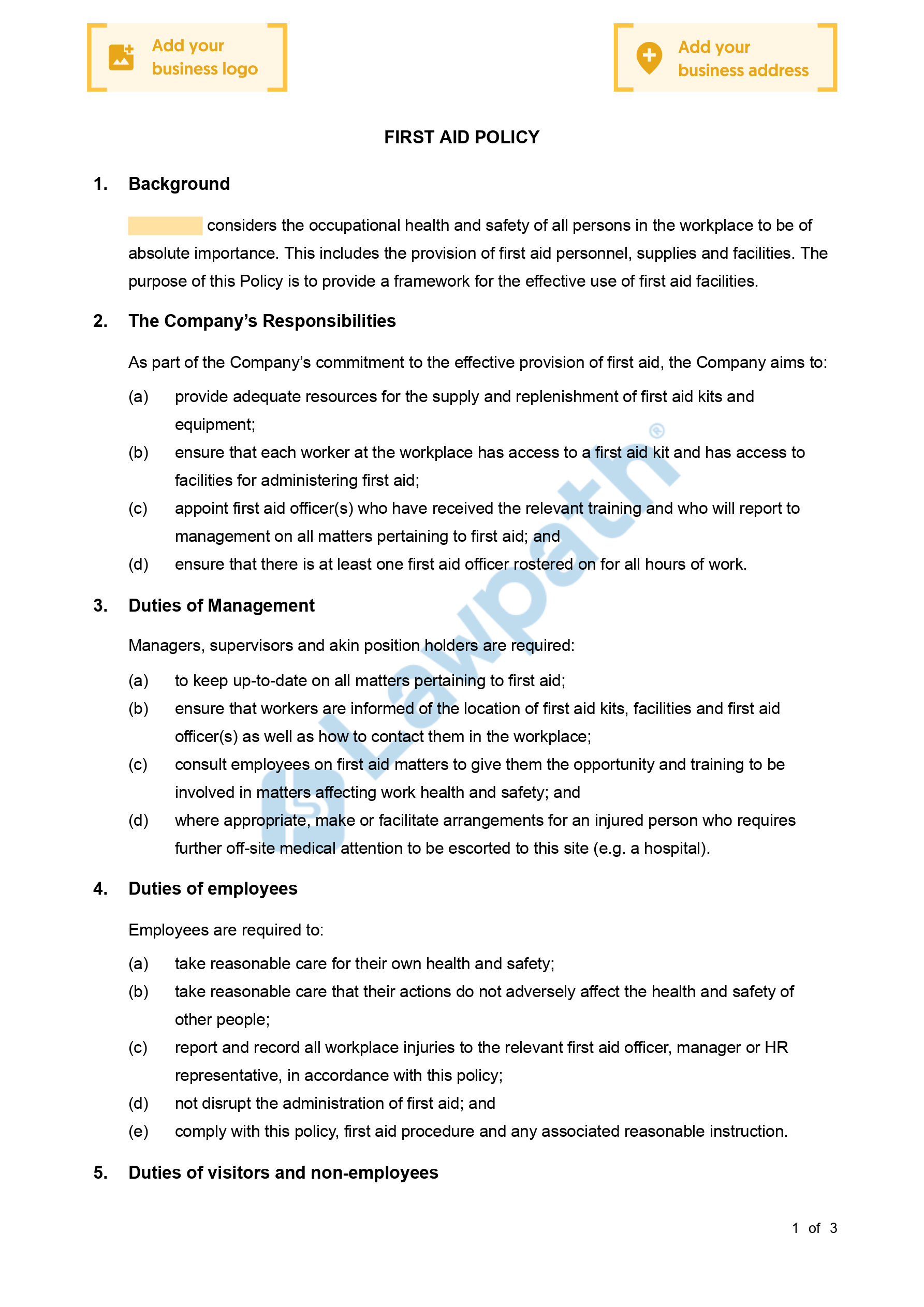 This First Aid Policy sets out the broad first aid obligations of a company and its employees. This policy is a workplace document that can form part of your business’s HR and employment policies.
