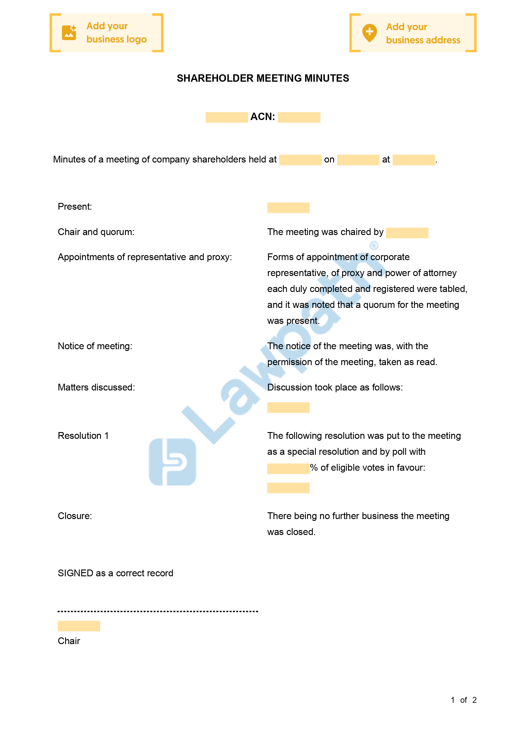 For a minutes for a shareholder meeting where only ordinary resolutions are being passed, see General Meeting Minutes (To Pass Ordinary Resolution).