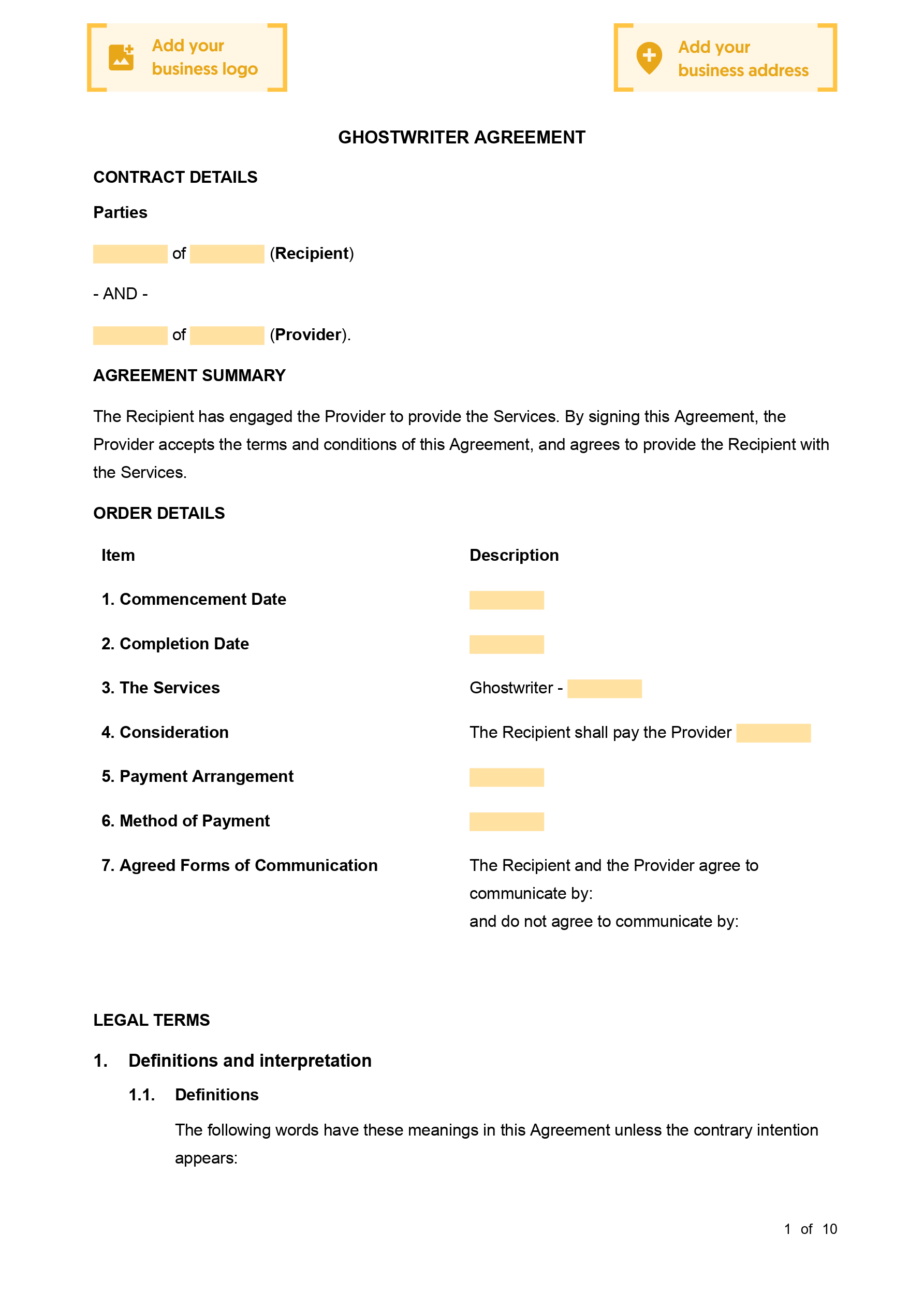 Please note that this agreement has been specifically designed for use when providing ghostwriter services. If your services are of a more general nature, then you can use our services agreement.