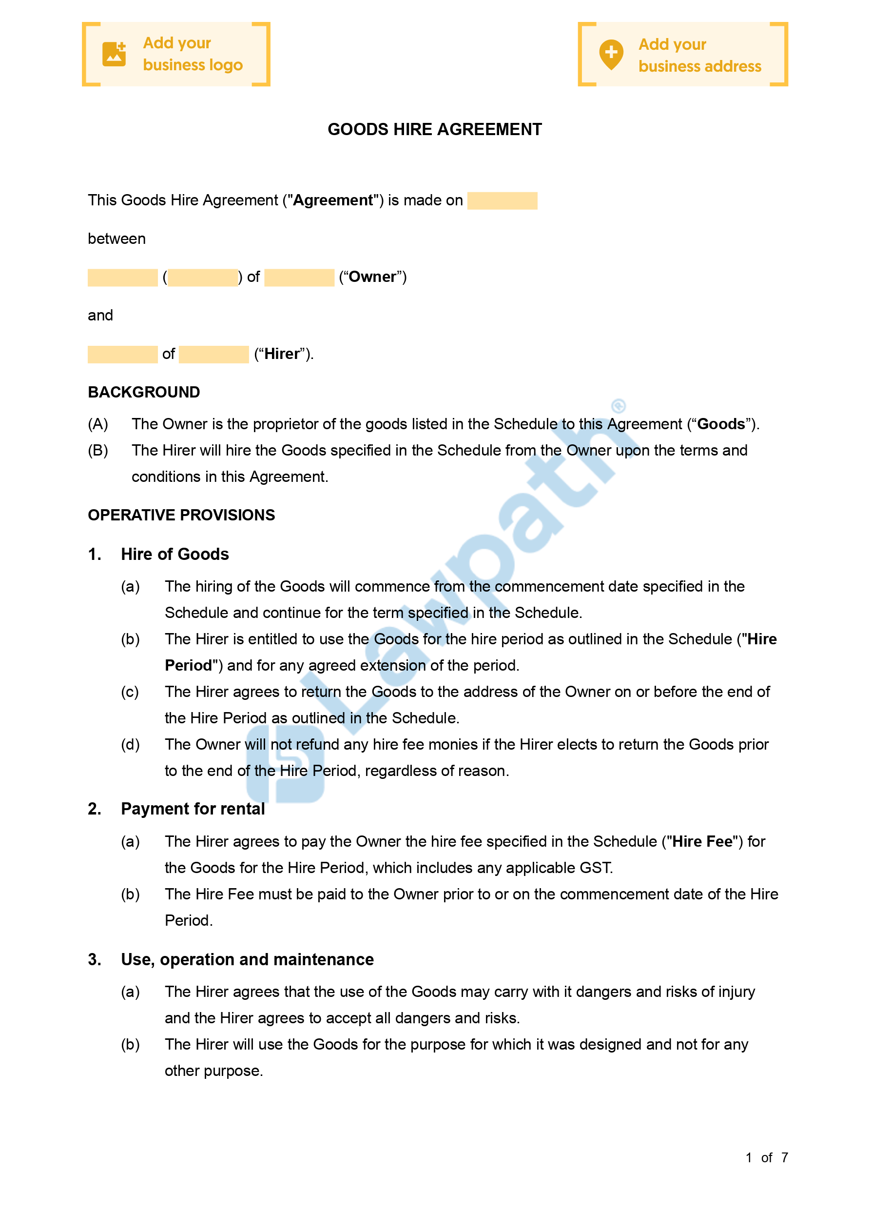 If your business hires out goods to customers, you should have a Goods Hire Agreement (Agreement). This Agreement clearly and accurately sets out the obligations, terms and conditions regarding the rental of goods. Put simply, it contains everything a customer (hirer) needs to know about the goods they rent.