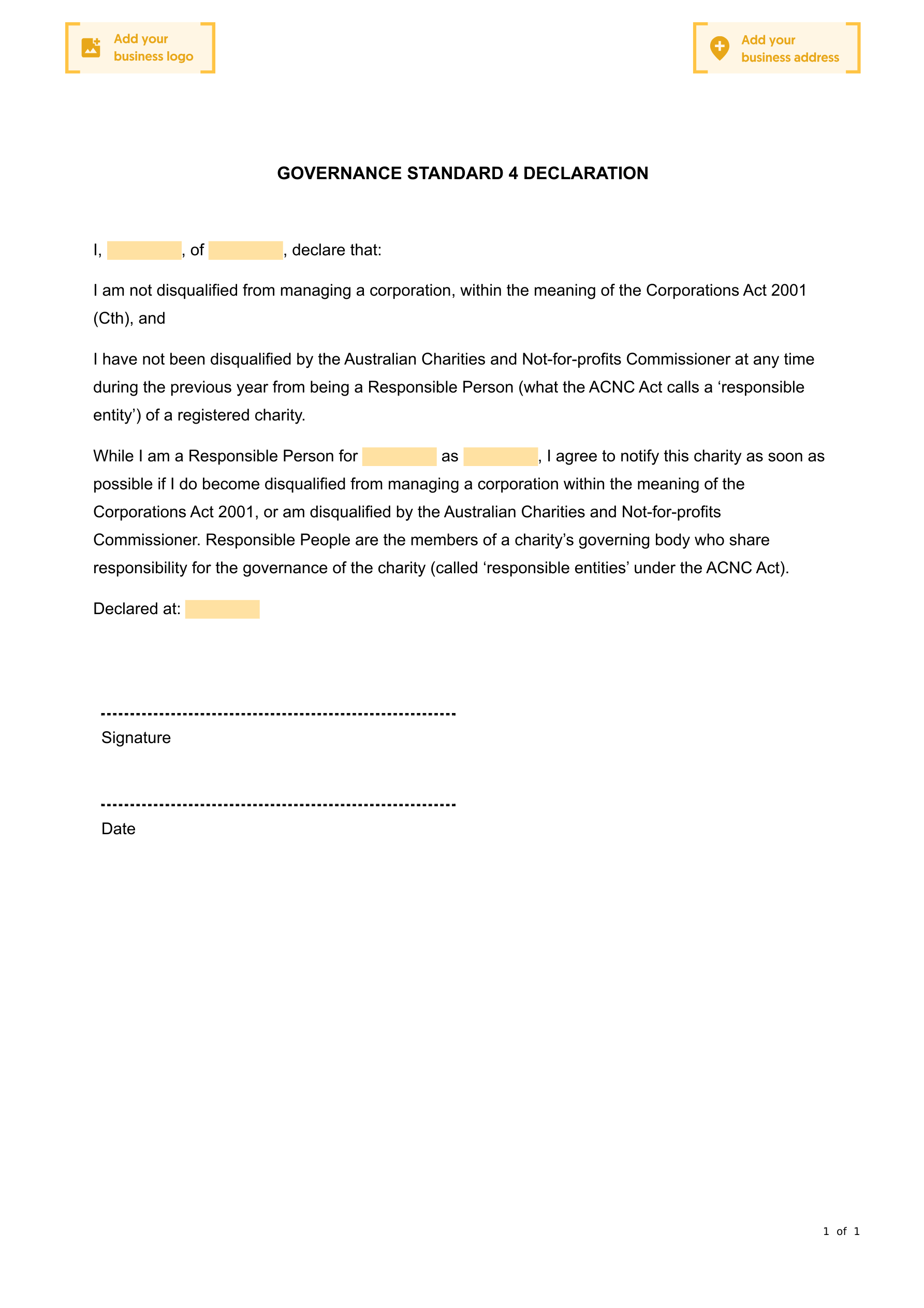 This Declaration can be used to confirm that a responsible person is not disqualified under ACNC Governance Standard 4.