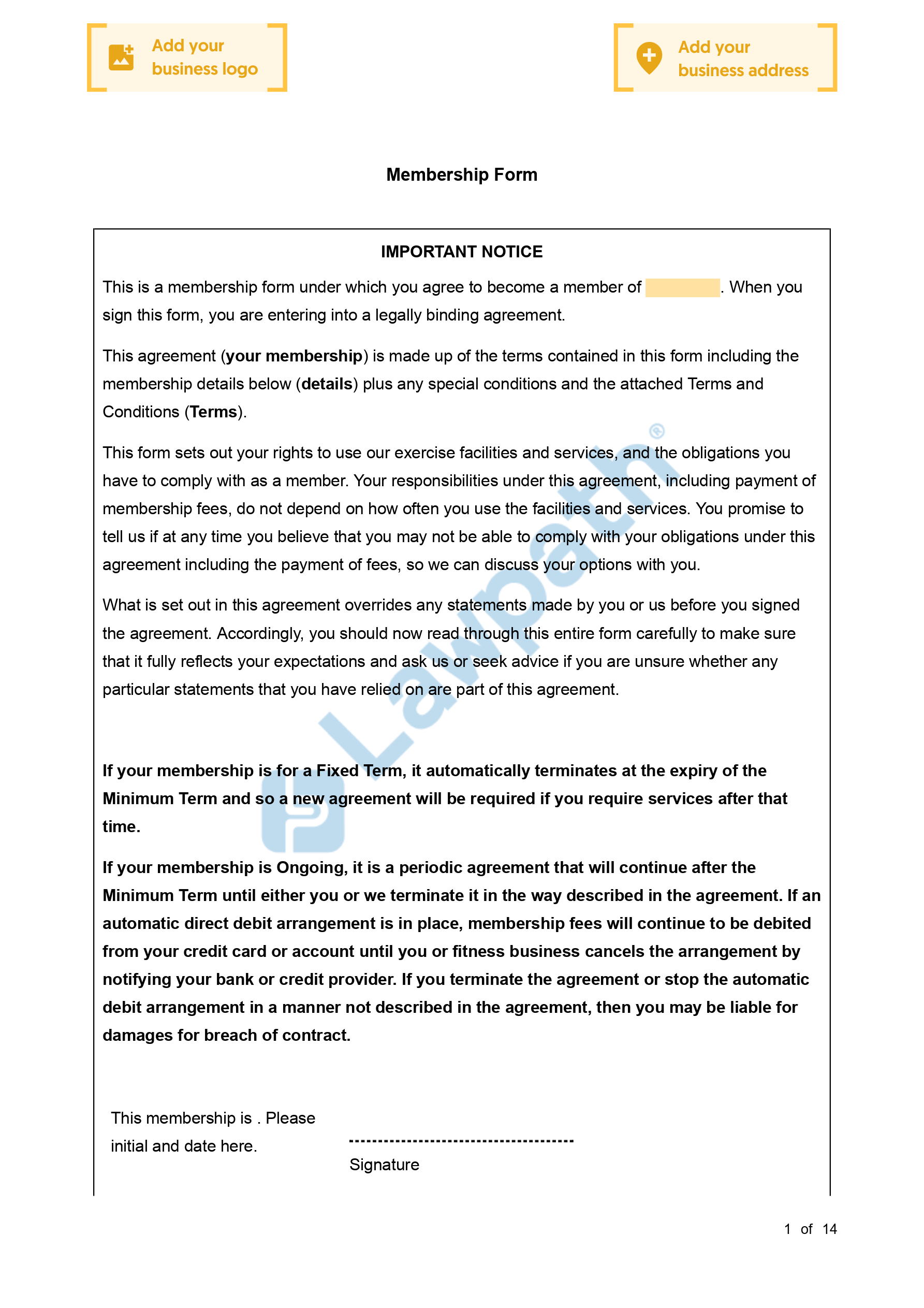 IMPORTANT: We highly recommend that you seek legal advice when drafting this form to ensure that it conforms with consumer laws in the State in which your gym is based. Consumer laws are subject to regular change. Additionally, where your business operates across multiple states, you should make a separate form for each state.