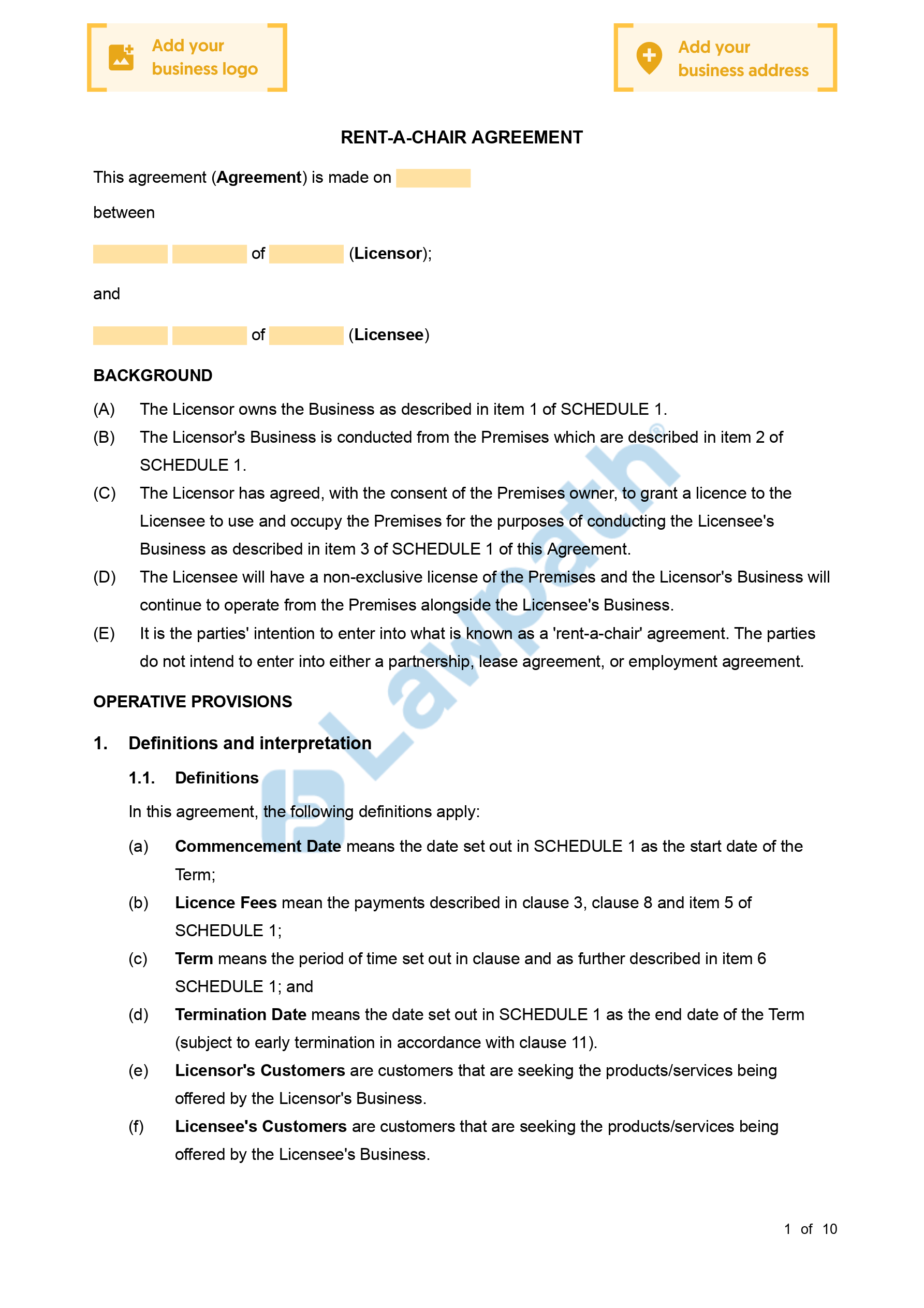 A Rent-A-Chair Agreement is an arrangement between a salon and a self-employed hairdresser, whereby the salon allows for the hairdresser to use the salon’s equipment and to operate within the salon’s premises.