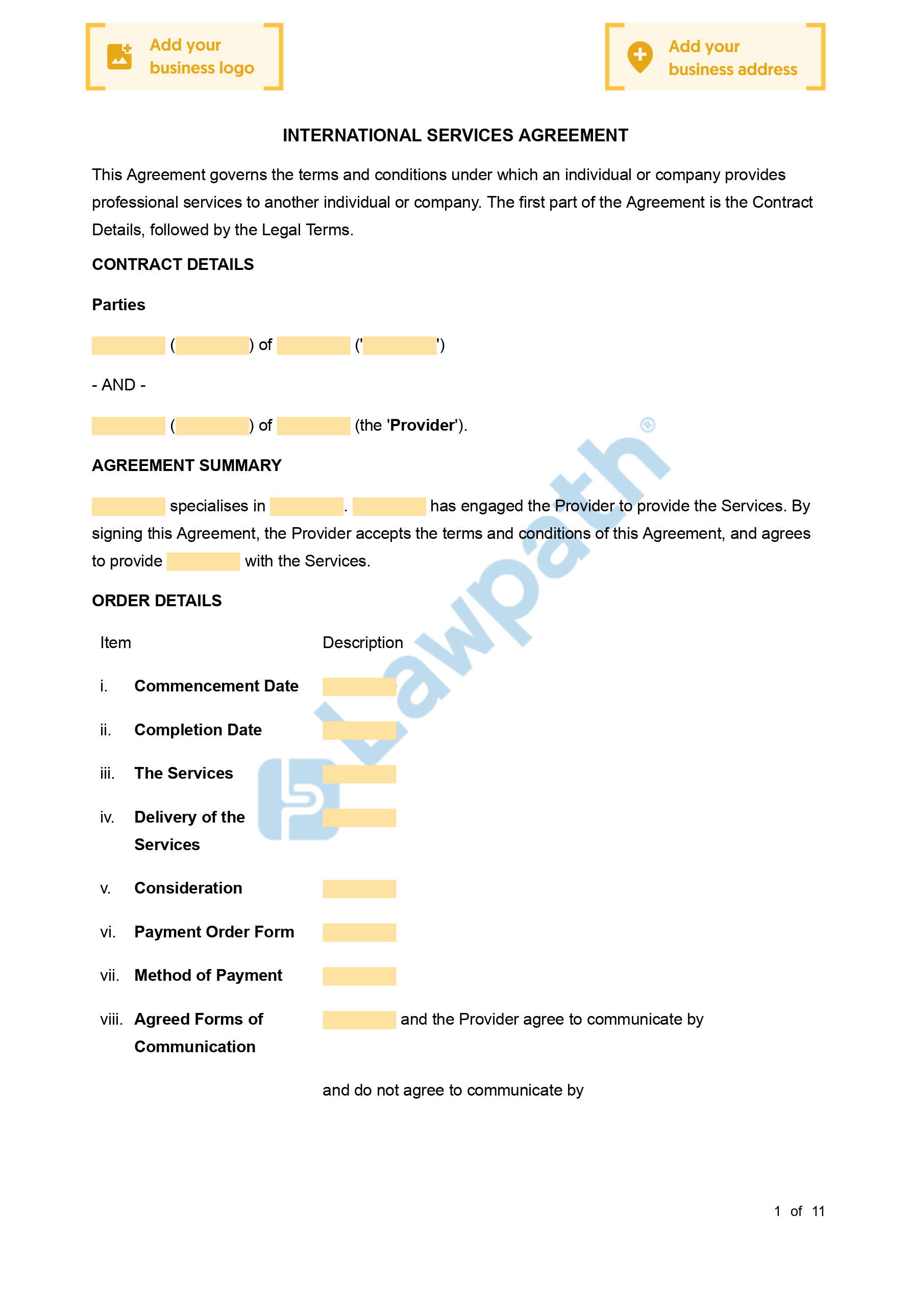 Please note that this agreement has been specifically designed for use when providing international services. If your services are of a more general or domestic nature, then you can use our services agreement.