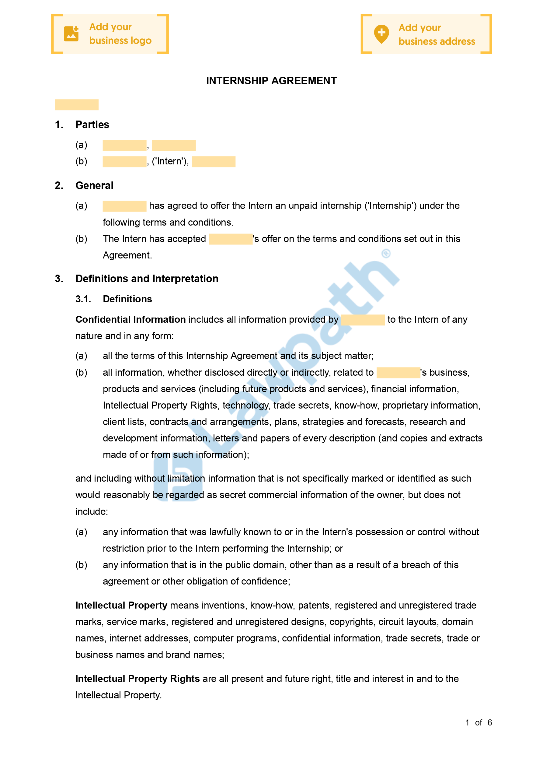 An Internship Agreement acts likes a contract between the business and unpaid intern. The intern would sign the agreement, making it a legally binding document.