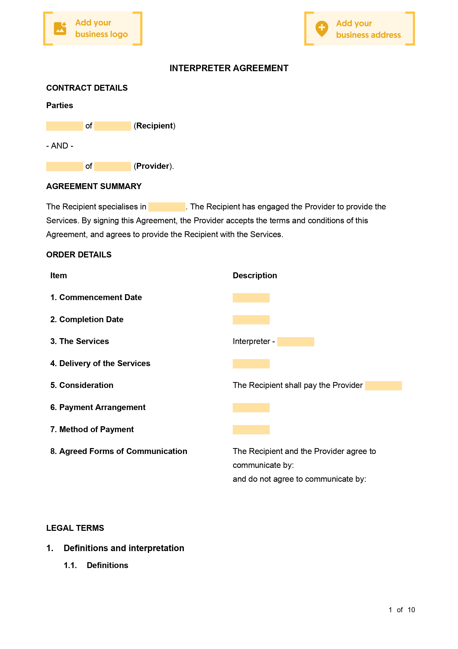 An Interpreter Agreement sets out the relationship between an interpreter and an individual or business receiving interpreting services.