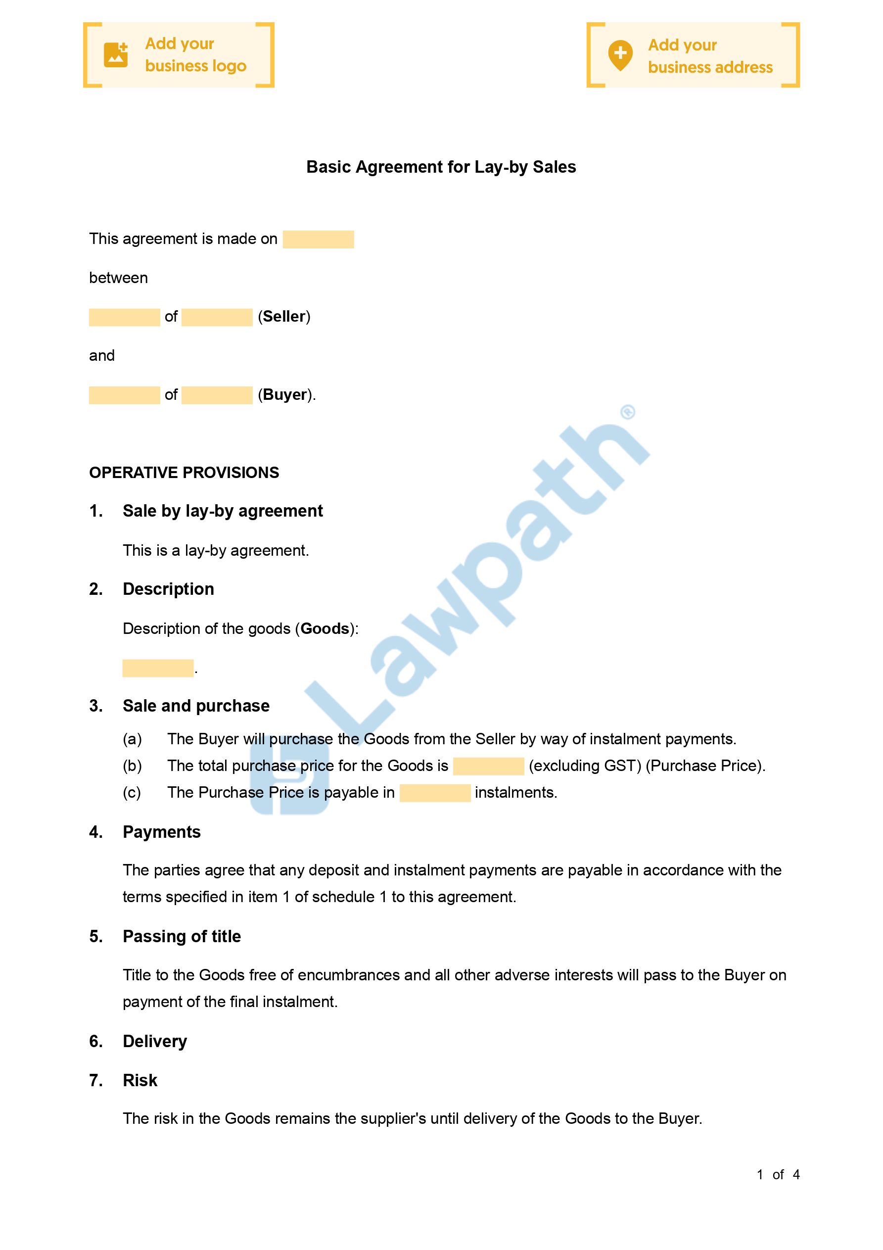 This lay-by agreement between a supplier of consumer goods and a consumer can be used for the sale of goods in return for an amount paid in instalments. The main concept behind a lay-by agreement is that until the purchase price has been paid in full, the supplier remains in possession of the goods.