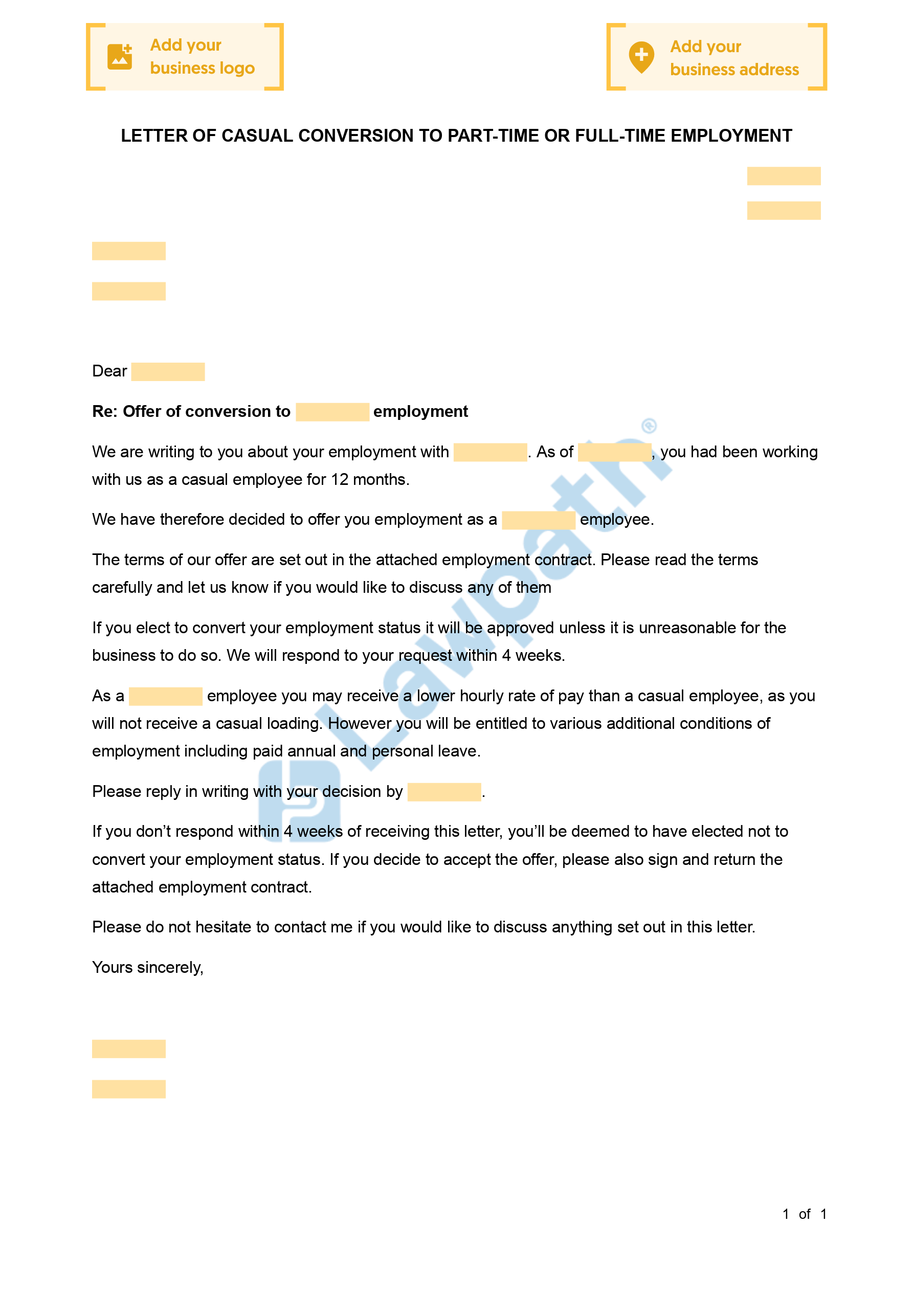 Complete your free Letter of Casual Conversion to Part-Time or Full-Time Employment with our checklist
